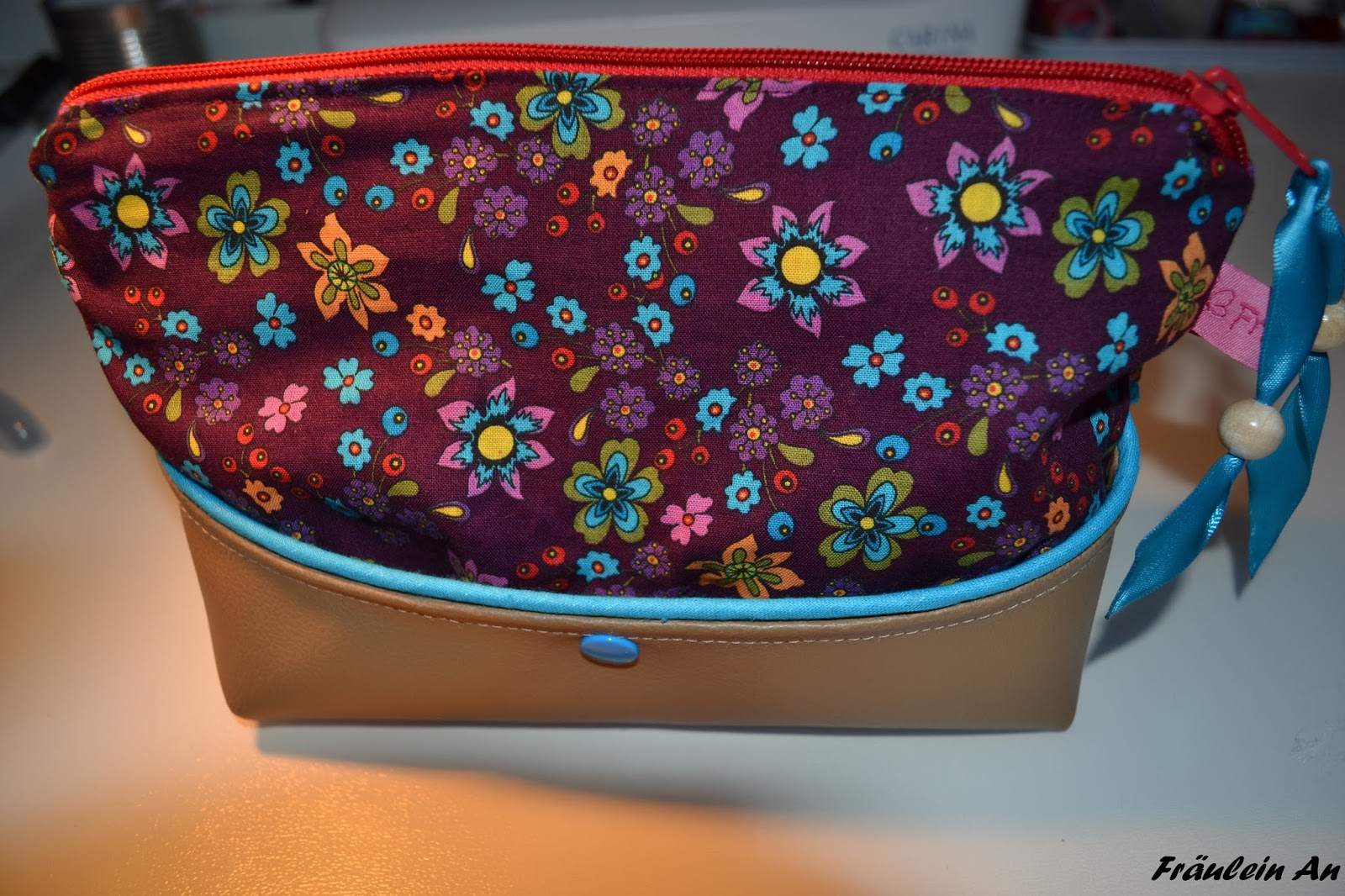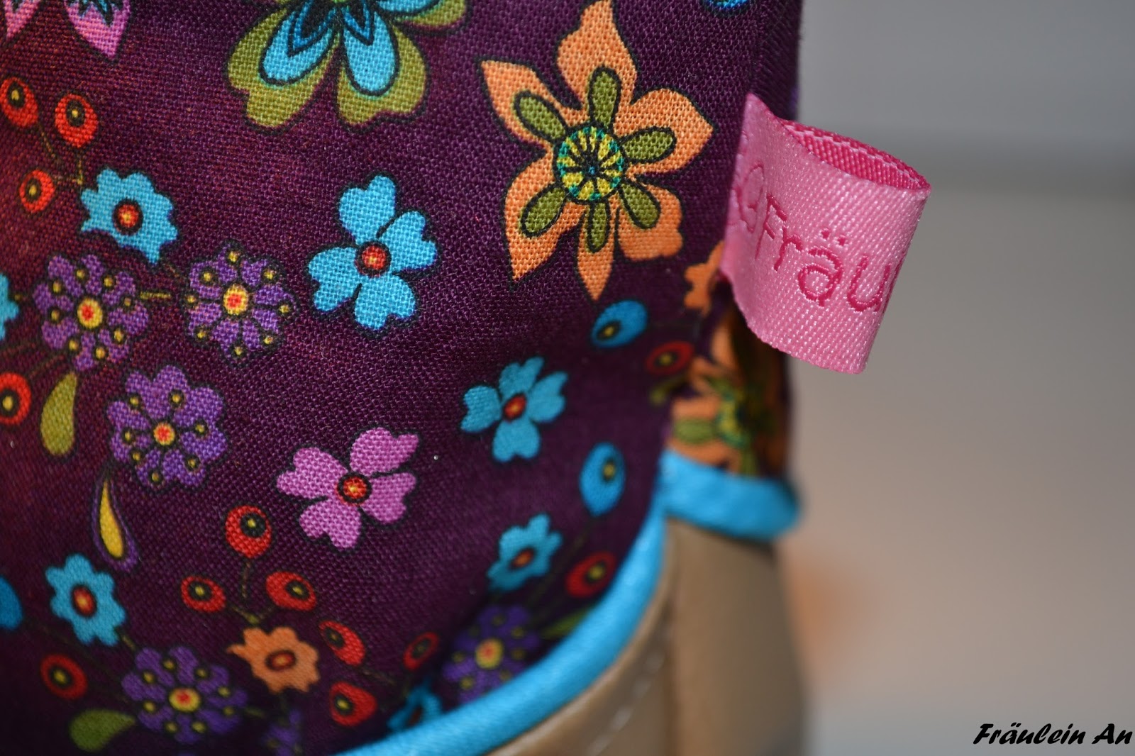 Entstanden ist nun eine Kombination aus hellem Kunstleder, lila Blümchen Baumwollstoff und Wachsstoff.