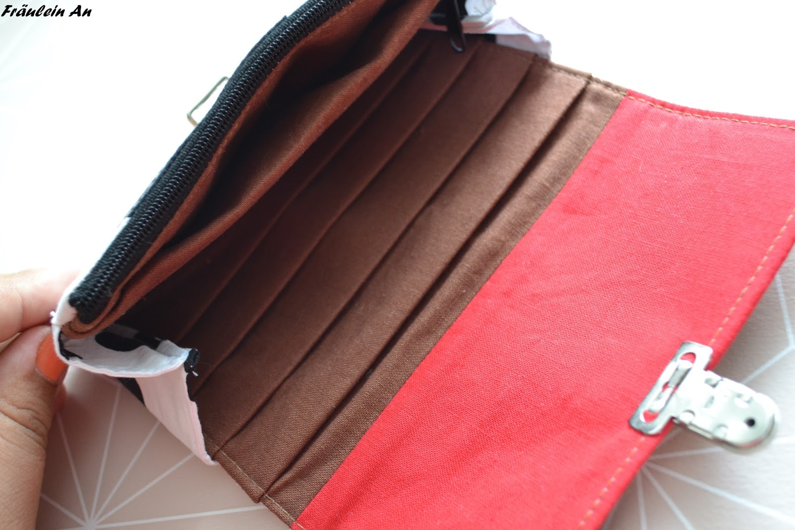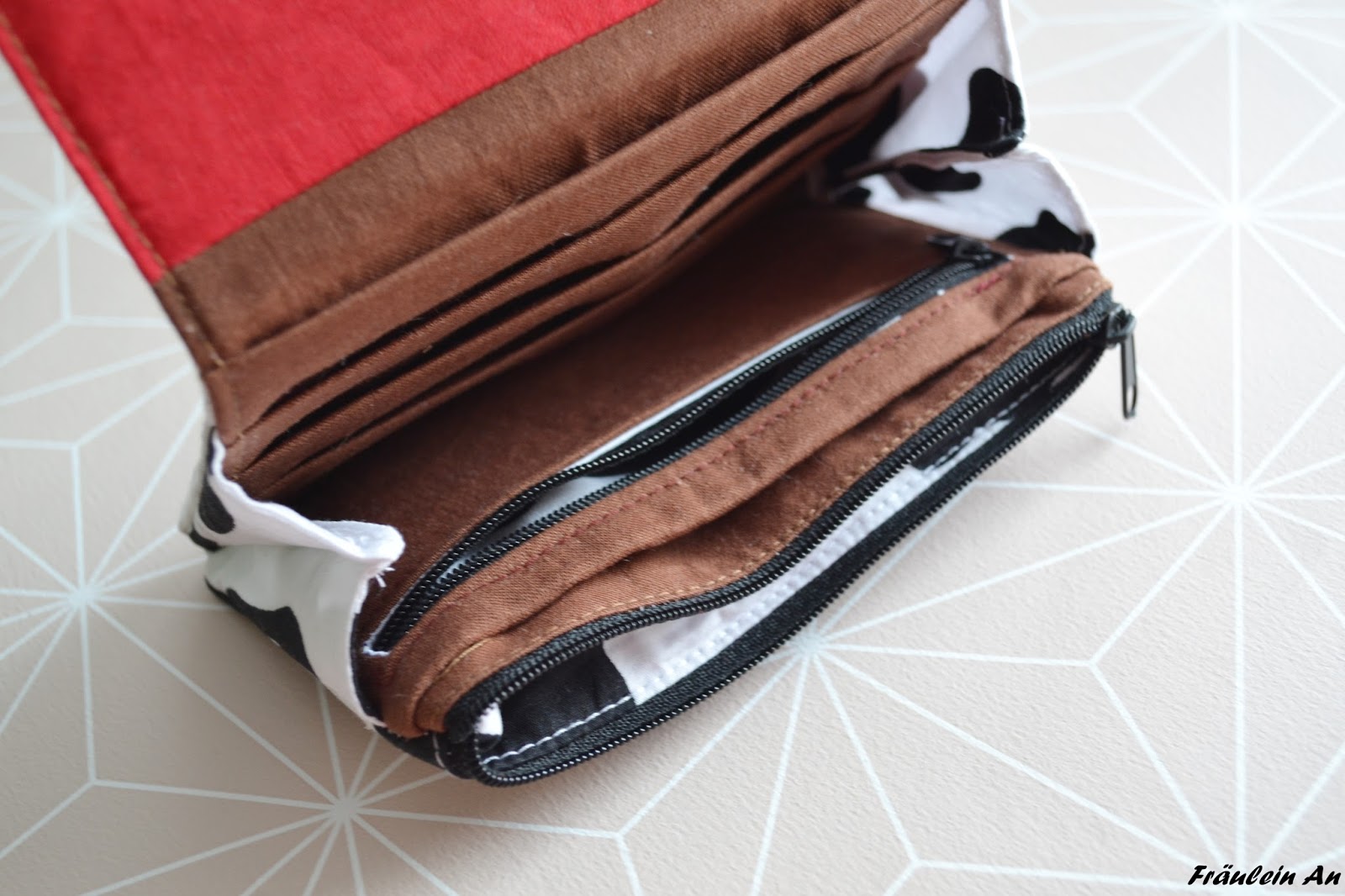Innen habe ich den Stoff geteilt. In der Klappe habe ich einen roten Unistoff verwendet und bei den Kartenfächern und Kleingeldfächern braunen. Sonst wäre es glaube ich zu viel Kuh geworden 🙂