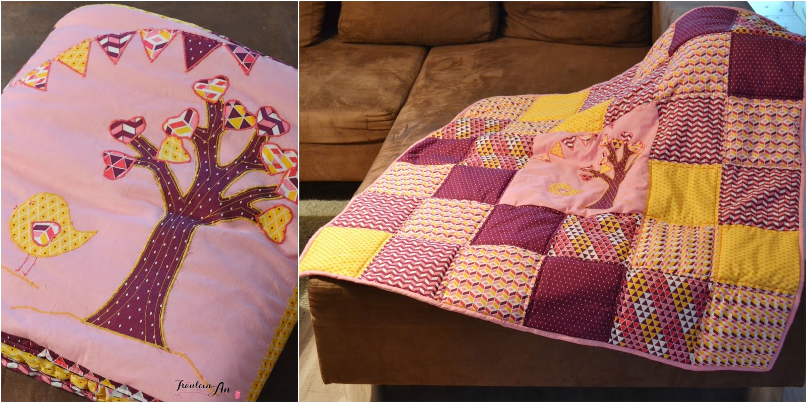 In der Mitte der Decke wollte ich gerne ein Highlight setzen und habe mich für einen Baum mit Herzförmigen Blättern, einer Wimpelkette und einem kleinen Vogel entschieden. Für die applizierten Stücke habe ich die gleichen Stoffe verwendet wie für den Rest der Decke.