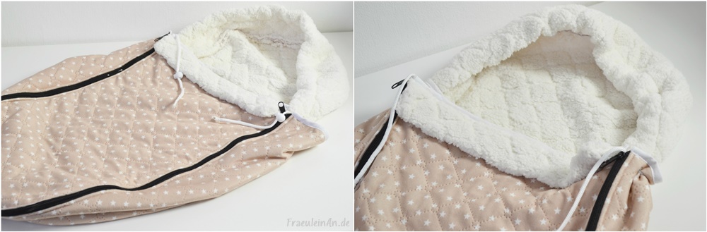 Geschlossen wird der Fußsack mit einem 2-Wege-Reißverschluss. Dieses war mir persönlich sehr wichtig, damit ich den Fußsack von beiden Seiten öffnen kann.