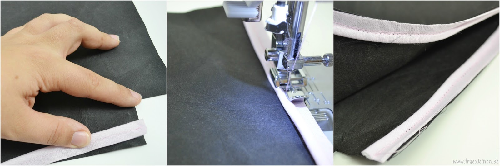 Kurz vor dem Ende faltet ihr das Schrägband einmal nach innen um und legt es wieder schön um die Kante.