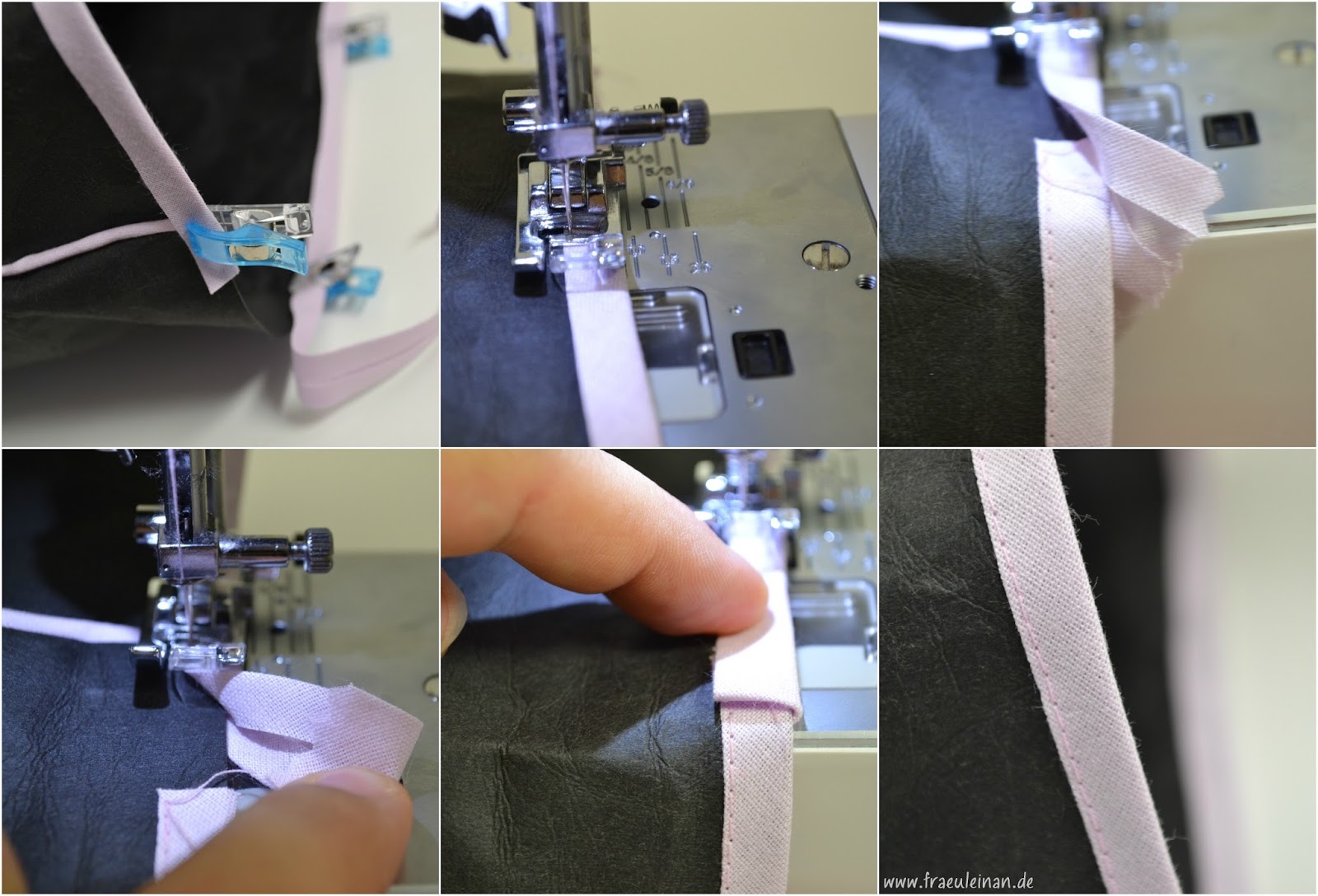 Steckt das Schrägband mit ein paar Wonderclips entlang der Kante fest. Lasst am Ende ca. 2-3 cm überstehen. Beginnt knappkantig zu nähen.