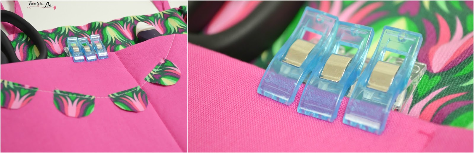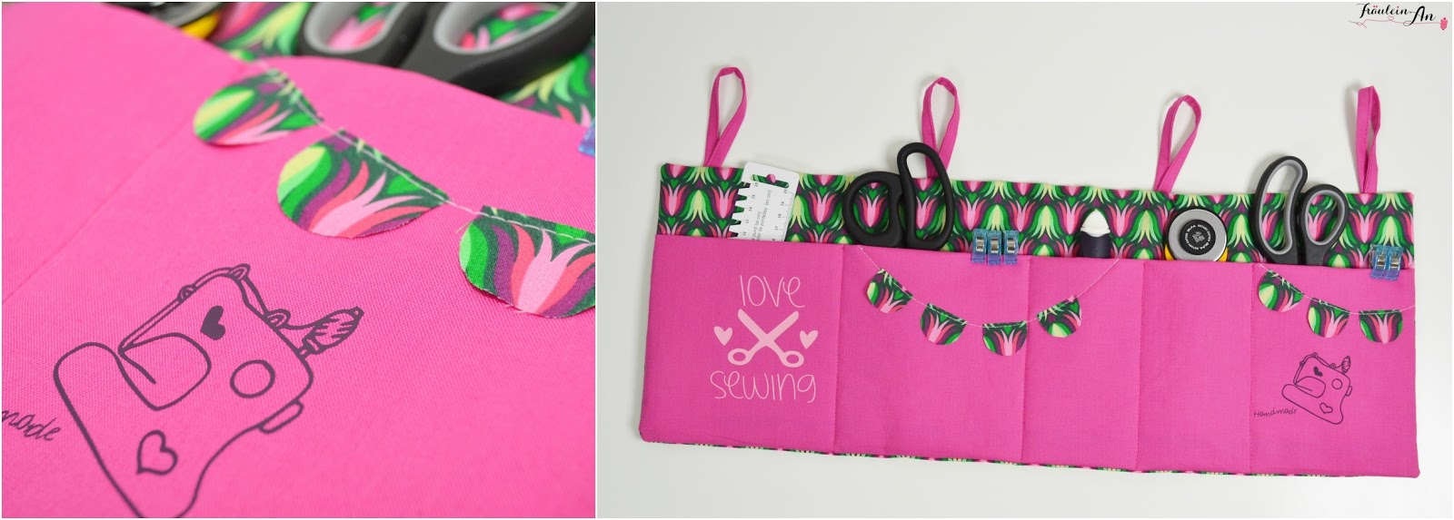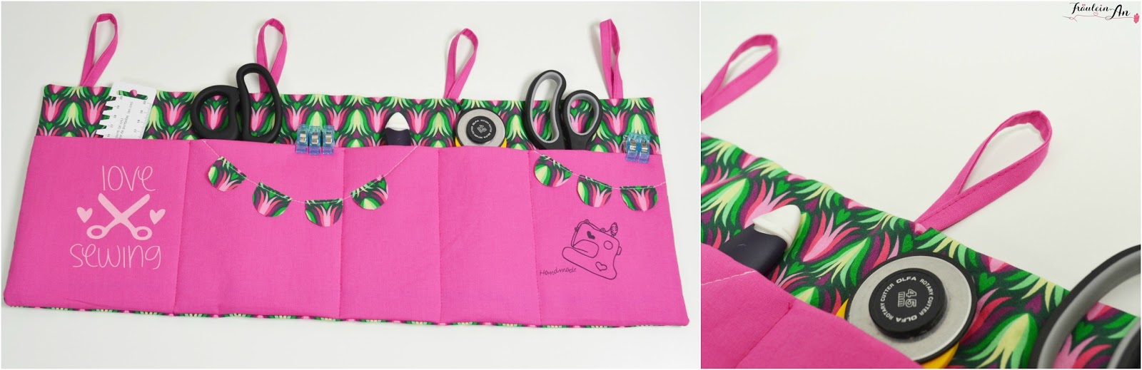Die Aufhänger des Untensilo habe ich so angenäht, dass sie bereits eine ausgeformte „Kurve“ bilden. Finde ich persönlich ganz schön und ich hoffe, dass das Utensilo somit nicht von der Wand oder meinem Zuschneidetisch absteht.
