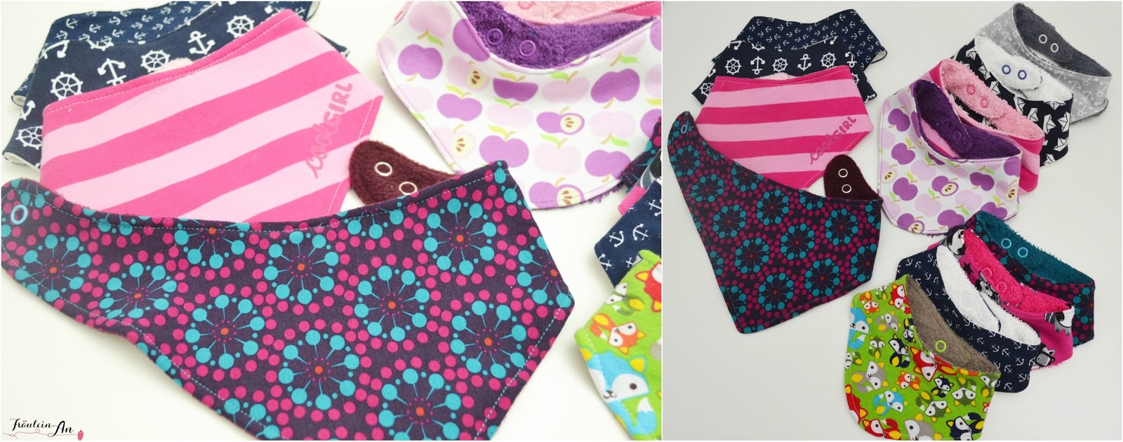 Genäht habe ich zwei unterschiedliche Größen und jeweils eine kleine Auswahl von 3-4 Tüchern. Da die Mädchenstoffe bei mir im Zimmer überwiegen, habe ich auf maritim gesetzt. Maritimestoffe sind nämlich so schön Geschlechtsneutral. Kombiniert mit einem Frotteestoff in wirklich ganz tollen Farben haben die Sabbertücher einen wunderbaren stand und weichen nicht schnell durch.
