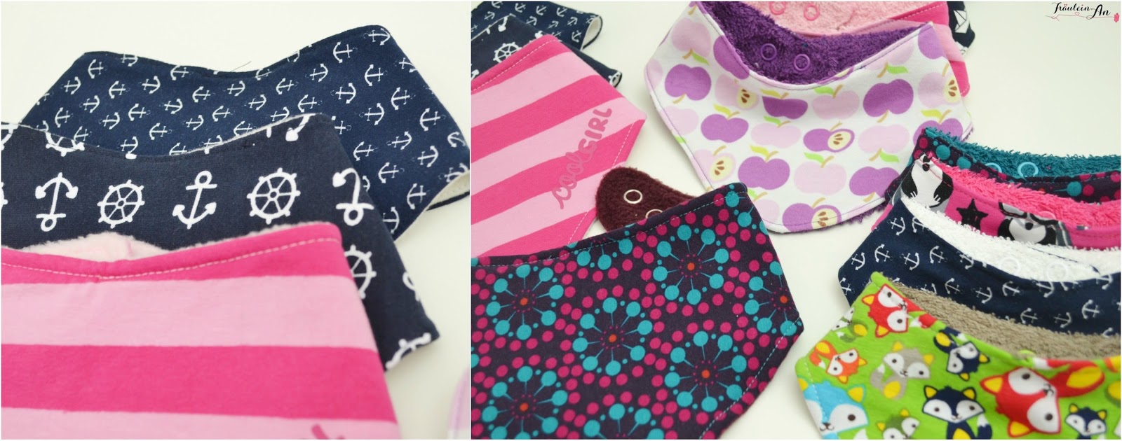 Genäht habe ich zwei unterschiedliche Größen und jeweils eine kleine Auswahl von 3-4 Tüchern. Da die Mädchenstoffe bei mir im Zimmer überwiegen, habe ich auf maritim gesetzt. Maritimestoffe sind nämlich so schön Geschlechtsneutral. Kombiniert mit einem Frotteestoff in wirklich ganz tollen Farben haben die Sabbertücher einen wunderbaren stand und weichen nicht schnell durch.