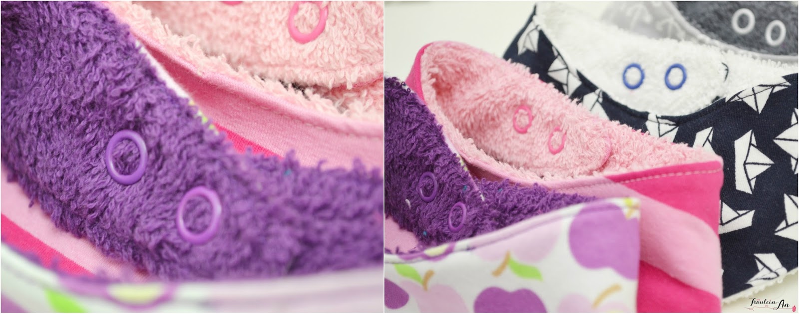 Genäht habe ich zwei unterschiedliche Größen und jeweils eine kleine Auswahl von 3-4 Tüchern. Da die Mädchenstoffe bei mir im Zimmer überwiegen, habe ich auf maritim gesetzt. Maritimestoffe sind nämlich so schön Geschlechtsneutral. Kombiniert mit einem Frotteestoff in wirklich ganz tollen Farben haben die Sabbertücher einen wunderbaren stand und weichen nicht schnell durch.