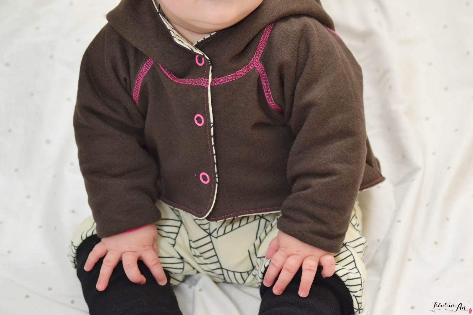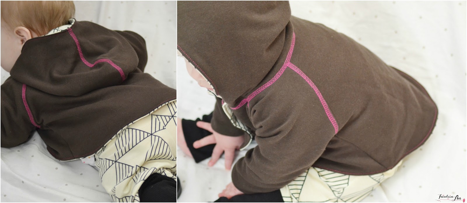 Somit wurde aus altrosa dunkel braun. Genau genommen bis auf den letzten Zentimeter habe ich meinen braunen Sweat vernäht. Das erste Mal habe ich ihn bei meiner jErika verwendet. Dann noch etwas bei der Linja und nun beim Jäckchen.