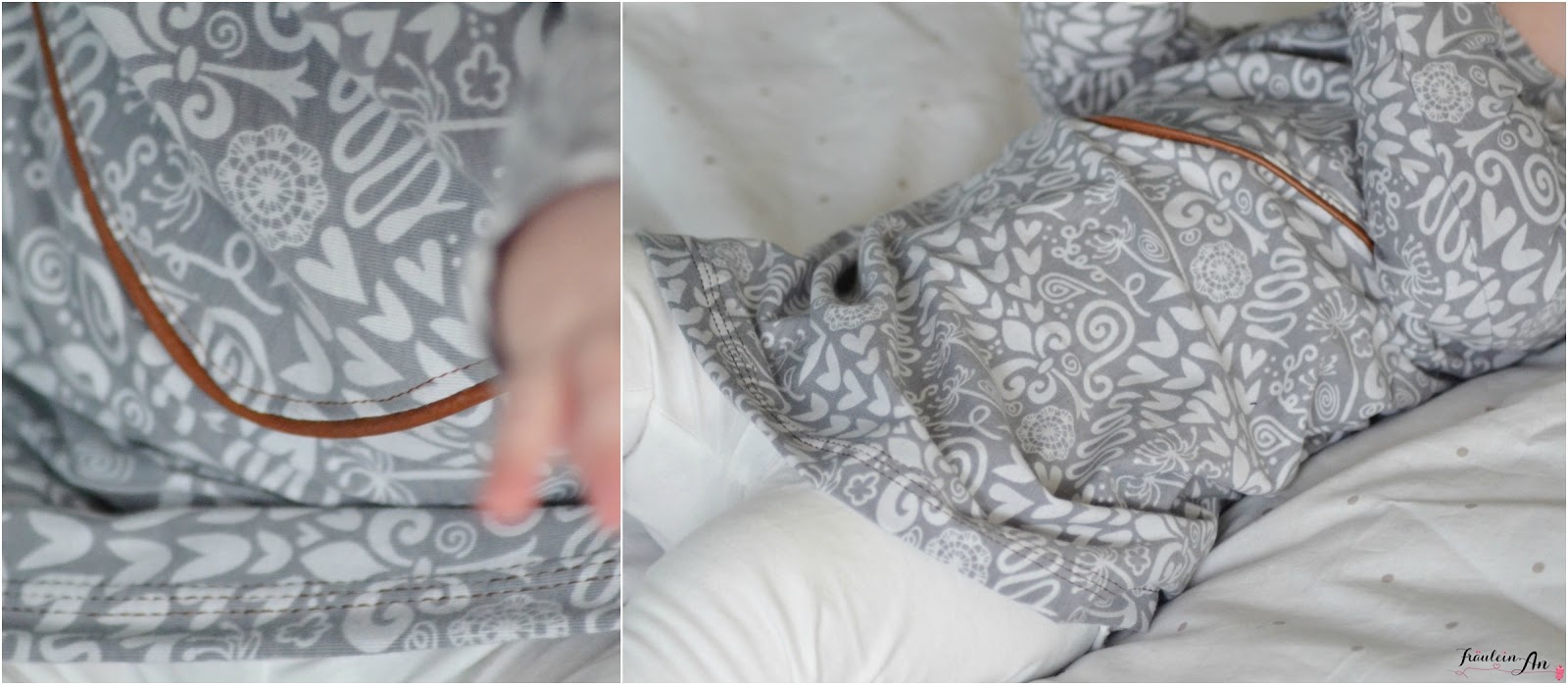 Kombiniert habe ich den Stoff ganz schlichte mit einer braunen Lederpaspel. Ich hatte die Kombination direkt vor Augen und aus diesem Grund musste der Latz einfach angenäht werden ;).