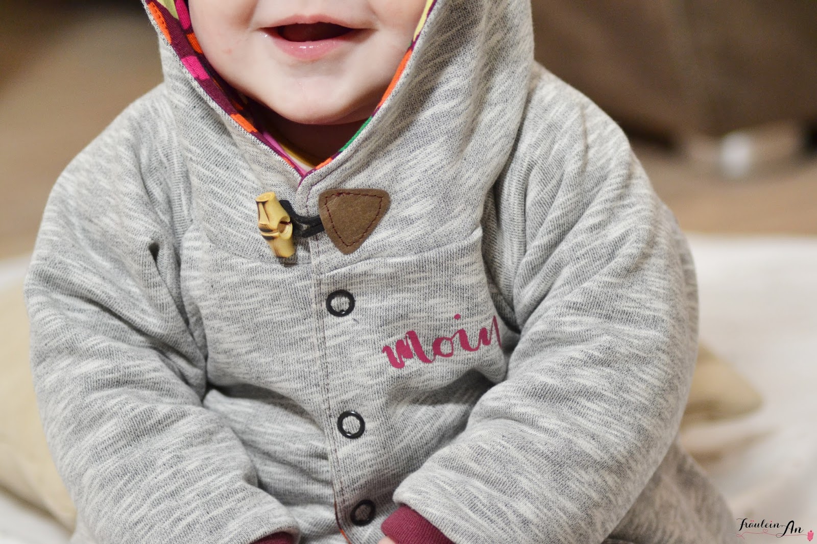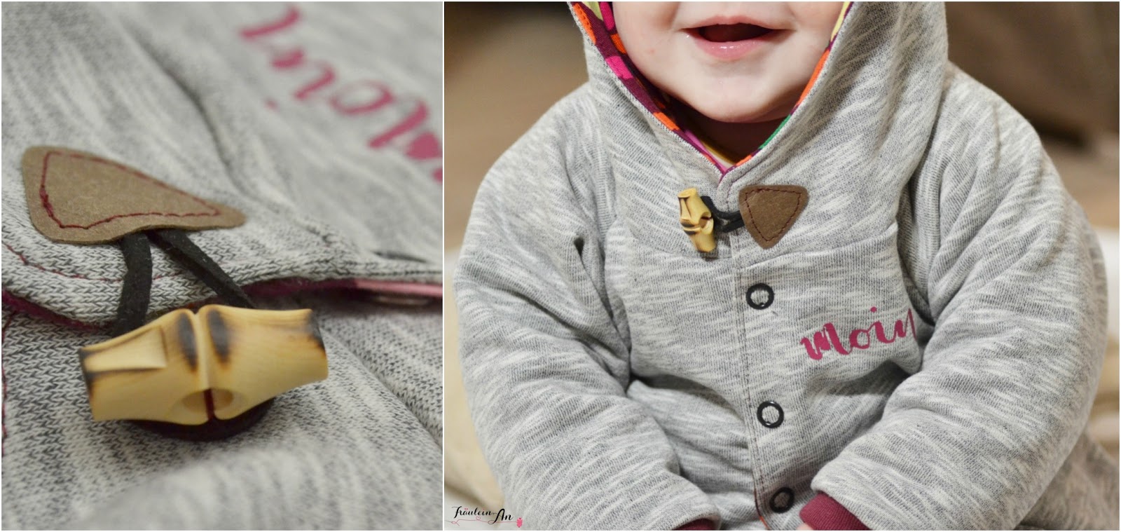 Um die Jacke optisch etwas aufzupeppen habe ich einen kleinen Knebelverschluss angenäht. Ich finde es so süß. Und die Maus hat im Maxi Cosi immer etwas zum drauf herum kauen ;-).