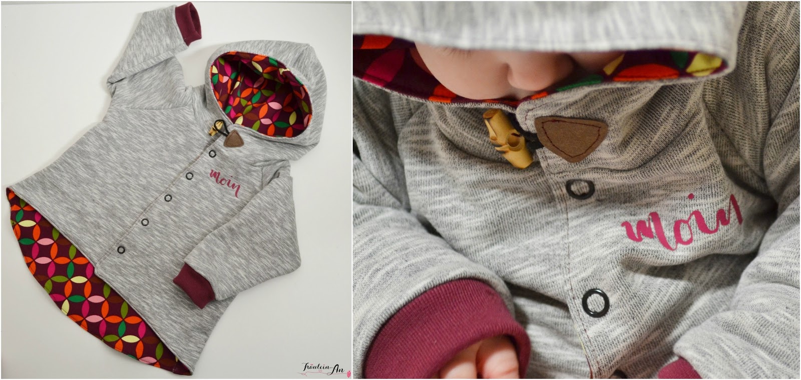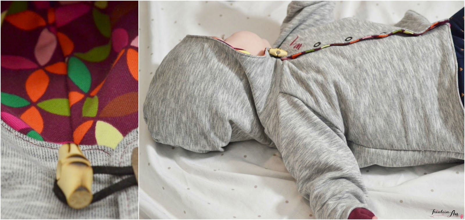 Um die Jacke optisch etwas aufzupeppen habe ich einen kleinen Knebelverschluss angenäht. Ich finde es so süß. Und die Maus hat im Maxi Cosi immer etwas zum drauf herum kauen ;-).
