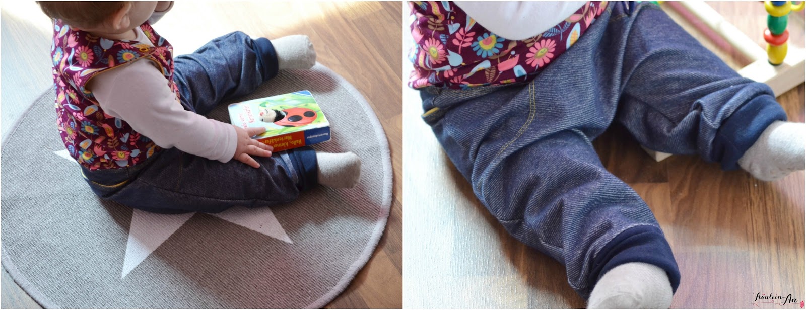 Ich habe für diesen traumhaften Strampler zwei wunderschöne Stoffe kombiniert. Der Jeansjersey von Lillestoff* ist wirklich klasse und so unglaublich weich. Echt toll.