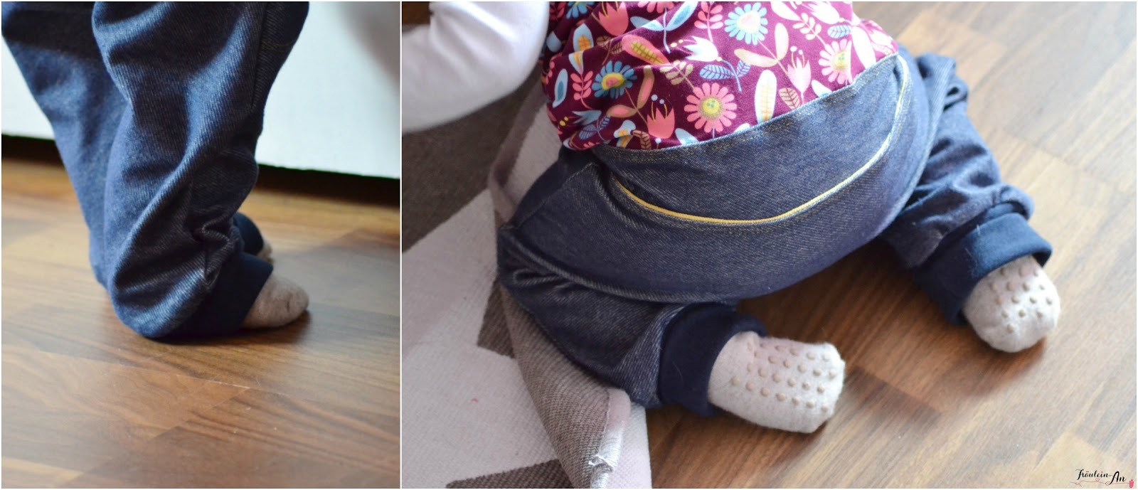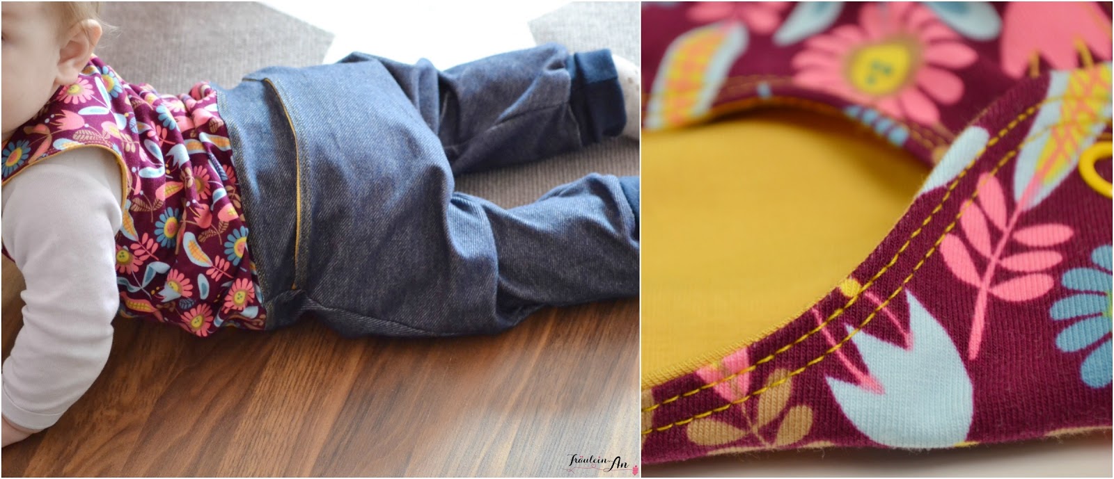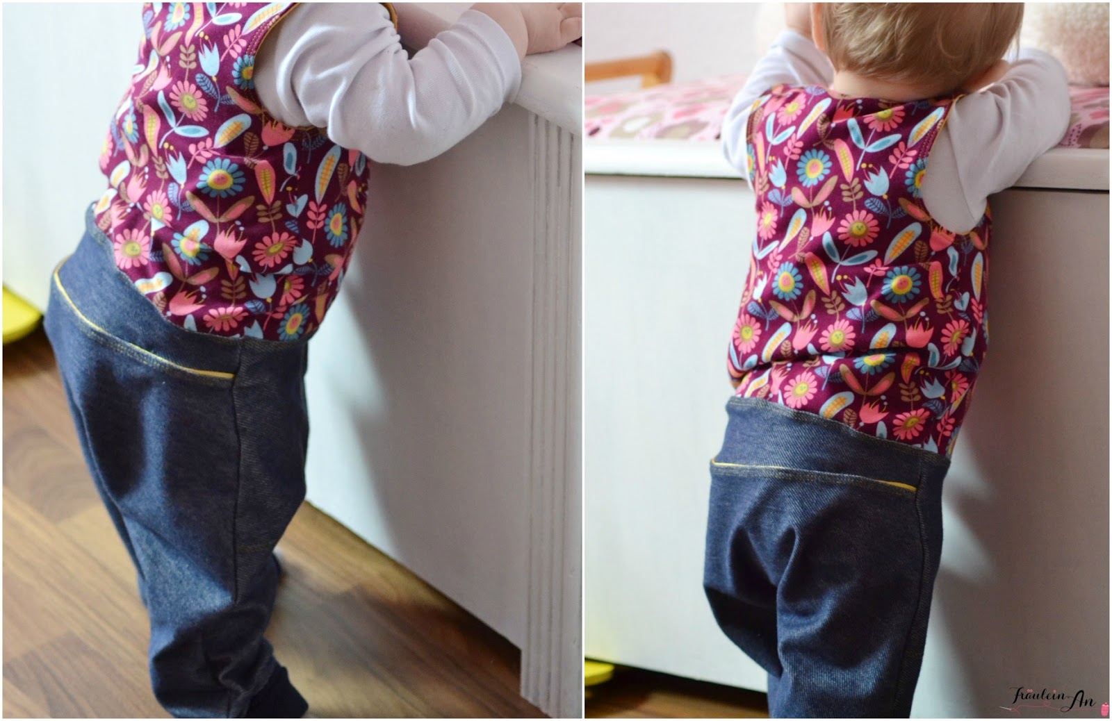 Ich habe für diesen traumhaften Strampler zwei wunderschöne Stoffe kombiniert. Der Jeansjersey von Lillestoff* ist wirklich klasse und so unglaublich weich. Echt toll.