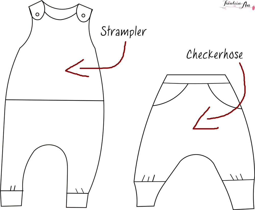 Vom Strampler benötigt ihr die Oberehälfte und die Checkerhose benötigt ihr dementsprechend komplett. Zudem die Beinbündchen und das Bauchbündchen.