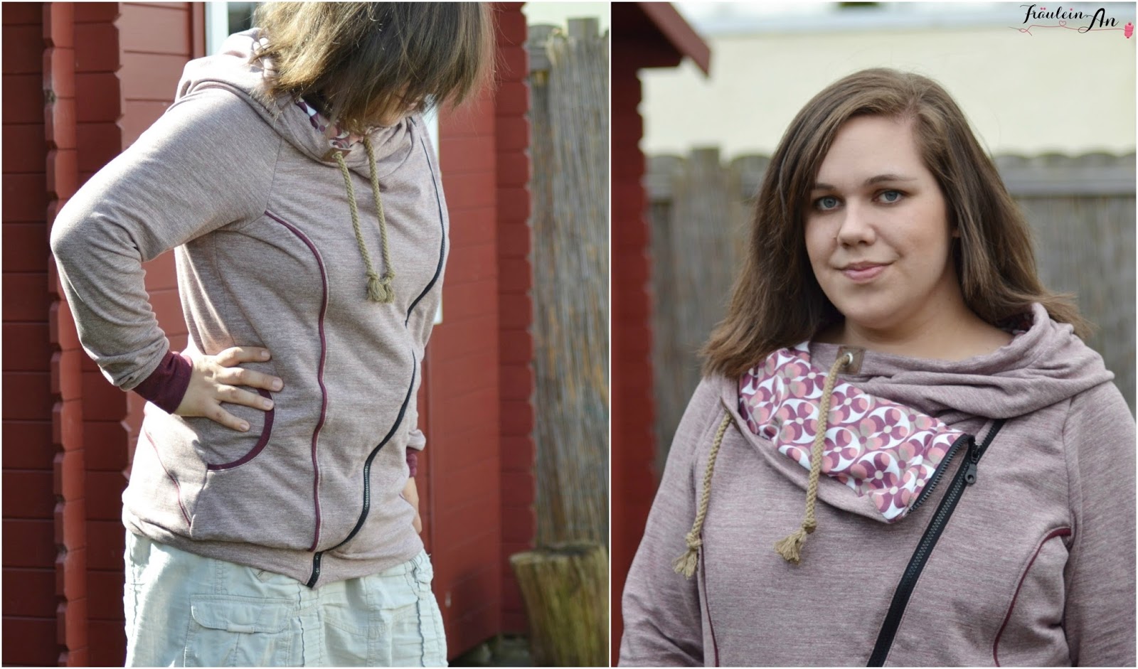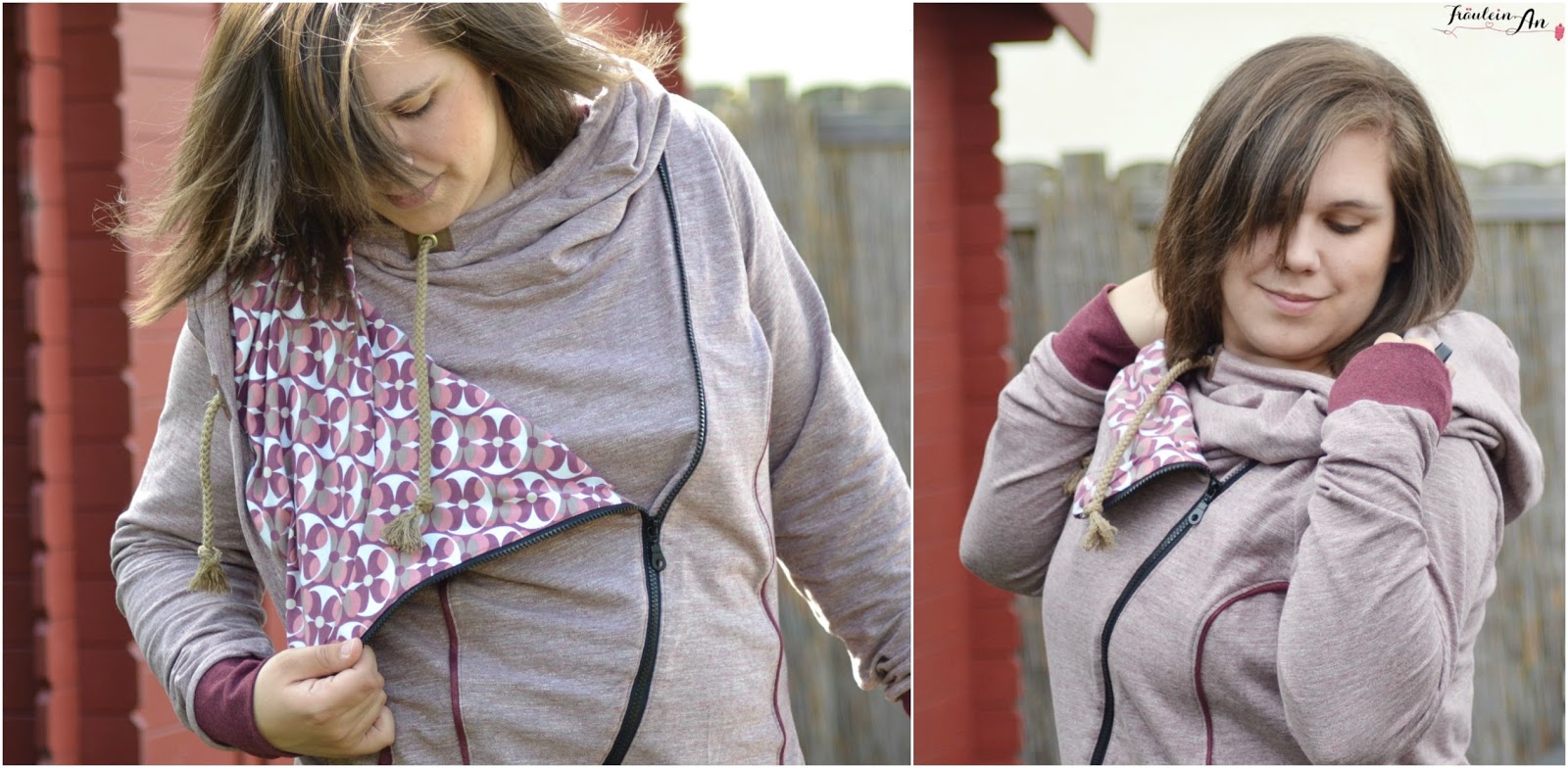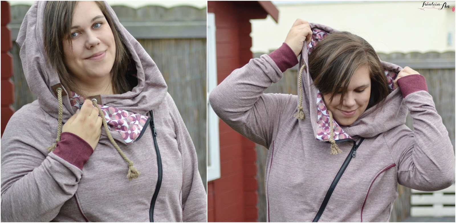 Der schräge Reißverschluss fällt einen natürlich gleich in den Blick und dann noch der mega coole Kragen oder die mega coole Kapuze. Ich liebe Kapuzen an Hoodies und Jacken und bei mir müssen sie eigentlich immer dran sein. Ja was sagt sie da Kragen und Kapuze? ;-). Der Schnitt beinhaltet beides. Somit kann man frei entscheiden, was man lieber nähen möchte.