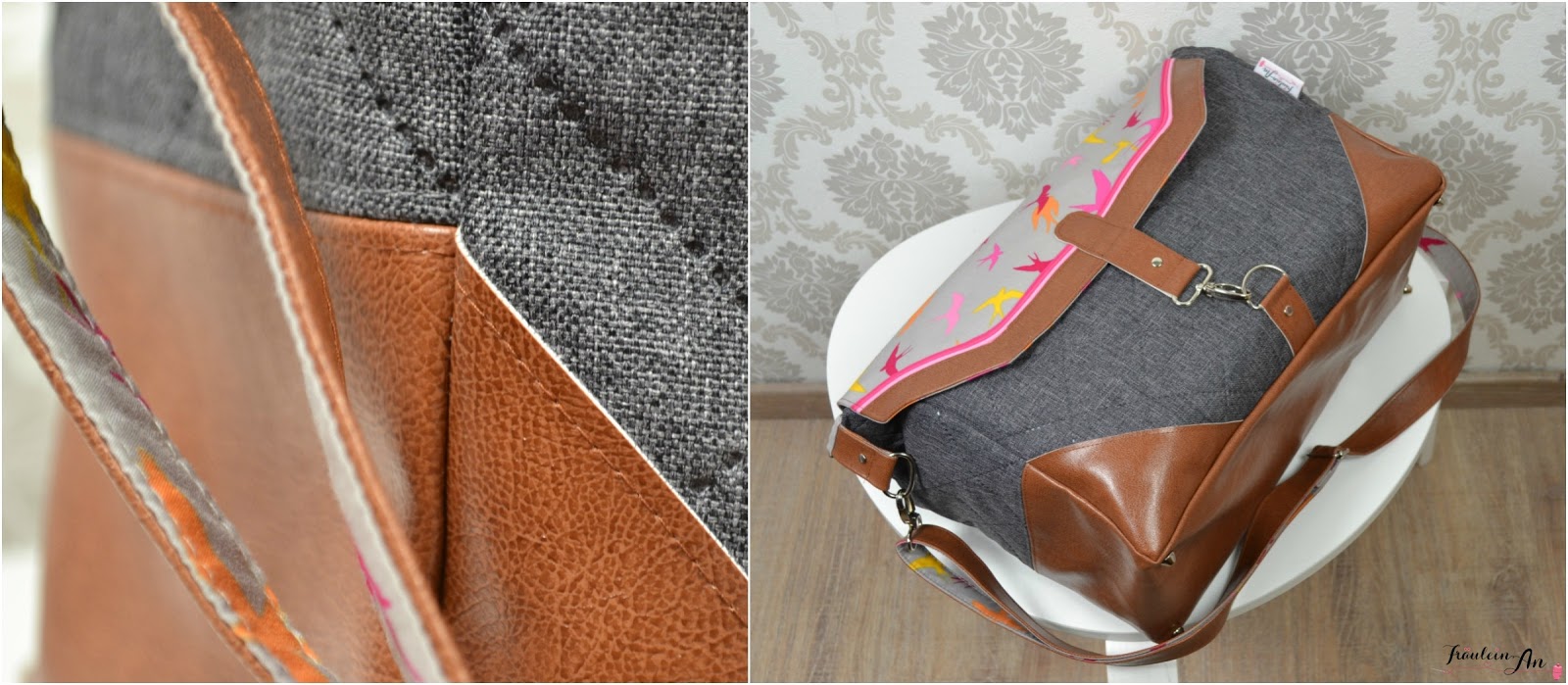 Aber ich finde, die Zeit hat sich gelohnt. Ich bin so verliebt in Stoff und Design. Der Taschenstoff in der Kombination mit dem Kunstleder und dem wunderschönen Schwalbenstoff gepaart mit Paspelband und und und. Ich bin wirklich begeistert wie gut alles zusammen harmoniert.