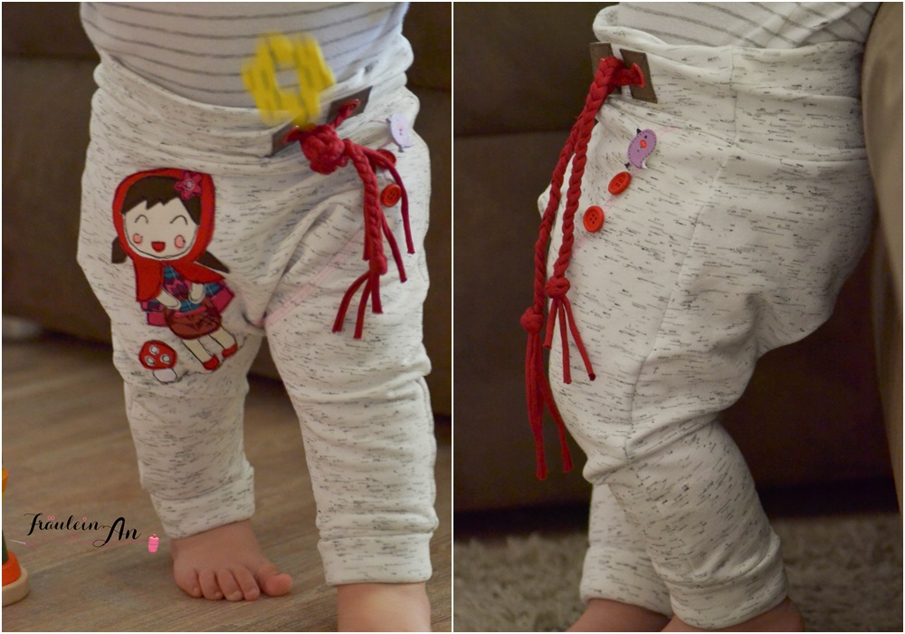 Passende rote Ösen zum Rotkäppchen habe ich gewählt und diese am Bund rechts orientiert, anstatt in der Mitte. Ein Tutorial inkl. Plotterfreebie für die SnapPap Unterlegung der Ösen gibt es morgen bei mir im Blog ;-). Ich habe den Bund auch aus dem Sweatstoff gemacht und damit die Hose nicht rutscht einfach ein Gummiband mit „eingenäht“.