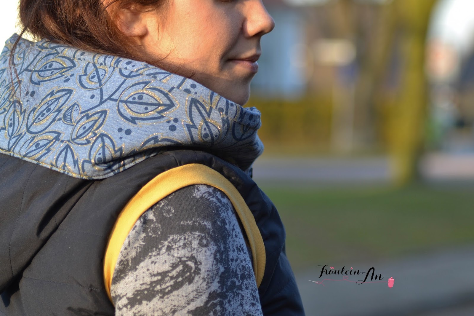 Der Innenstoff, der im Kragen und Kapuzenteil zum Vorschein kommt, sollte eigentlich die komplette Weste füttern – mangels Jersey habe ich hier nach langen Überlegungen zum Senffarbenen Jersey gegriffen. Diesen habe ich auch noch einmal als Ärmelabschluss verwendet. Und wisst ihr was, ich liebe es. Ich liebe die komplette Weste.