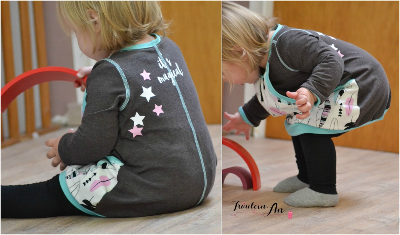 Da ich bei der Tunika gerne den Federjersey verwenden wollte, habe ich mich nur für den Spruch „it’s magical“ und ein paar Sternen entschieden. Die Farben der Flexfolie harmonieren so wunderbar mit dem Federjesey. Hach, die kleinen Details die mich beim Nähen immer sehr glücklich machen.