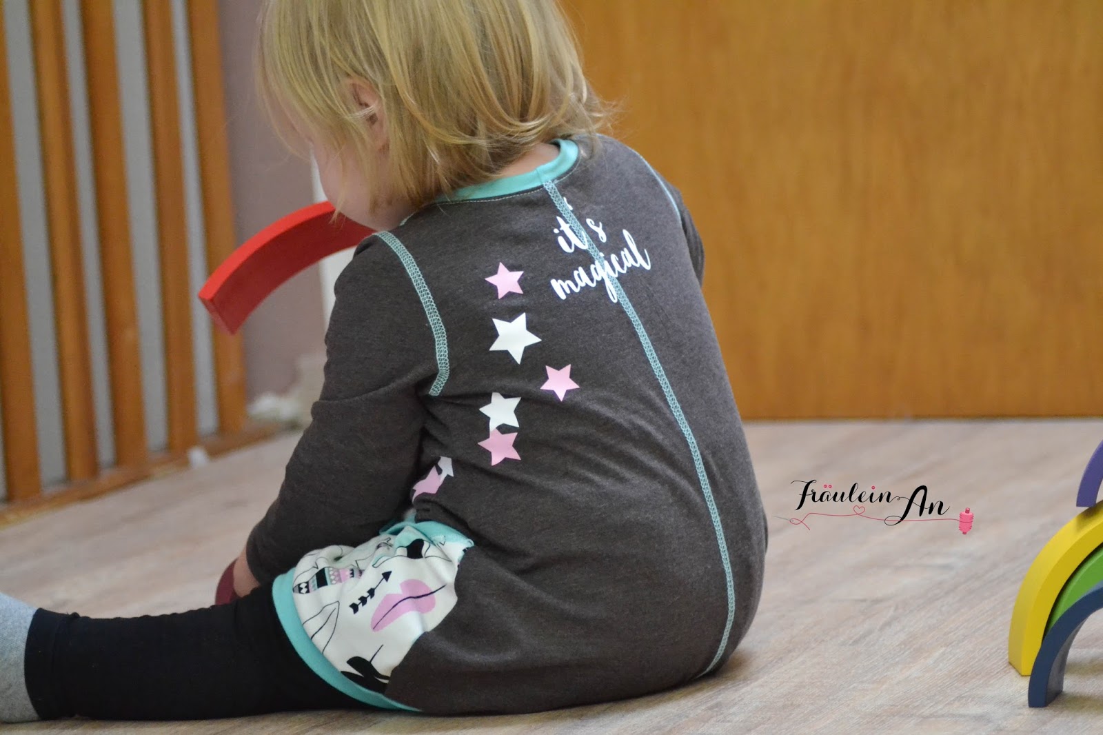 Da ich bei der Tunika gerne den Federjersey verwenden wollte, habe ich mich nur für den Spruch „it’s magical“ und ein paar Sternen entschieden. Die Farben der Flexfolie harmonieren so wunderbar mit dem Federjesey. Hach, die kleinen Details die mich beim Nähen immer sehr glücklich machen.