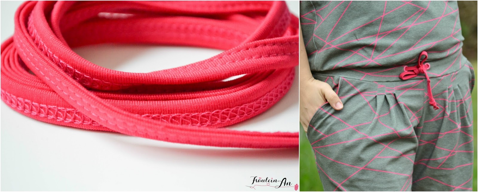 Einzig und allein was nun anders ist, dass ich für ein Band lediglich das Band cover und nichts einfasse. Dadurch das der Doppelfaltschrägbinder einmal oben und einmal unten rum „umschlägt“ habe ich auf beiden Seiten des entstehenden Bandes einen sauberen Abschluss.