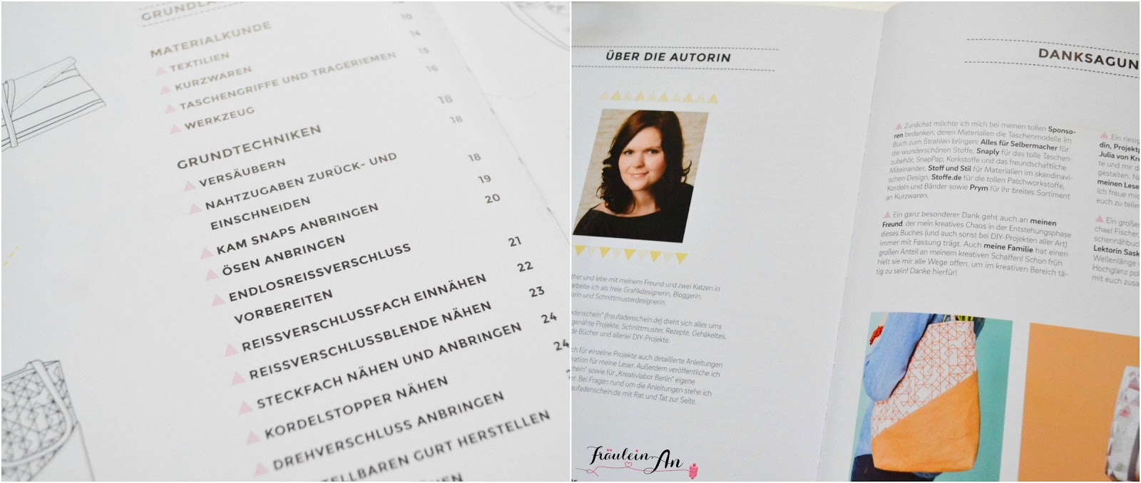Das Layout und die Gestaltung des Buches ist geradelinig und schlicht. Besonders gefällt mir der Aufbau. Bevor es zu den einzelnen Taschenmodellen los geht, werden die Grundlagen erklärt. Unter Grundlagen sind die Anleitungen für Taschengriffe, Kam Snap anrbringen oder oder oder erklärt. Eben alles, was du bei diesem Taschenbuch schnell nachschlagen kannst.