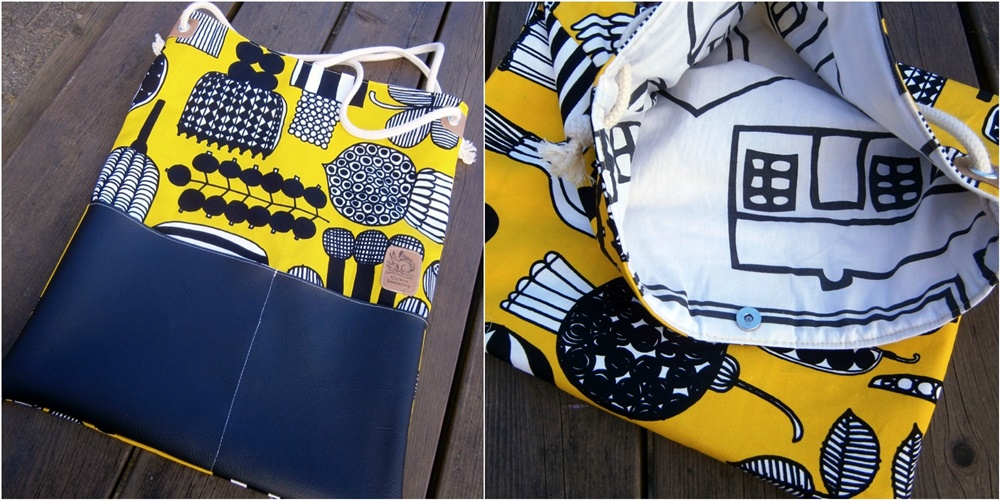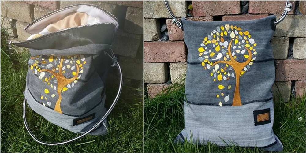 Die Tasche von Antje passt einfach perfekt zu ihrem Label „Die Federnaht“. Der Außenstoff ist wirklich toll und ich hätte sie mir genauso genäht. Die Patches hat sie aus weißem Kunstleder aufgenäht und die aufgesetzte Fronttasche ist aus Jeans – eine wunderbare Kombination!
