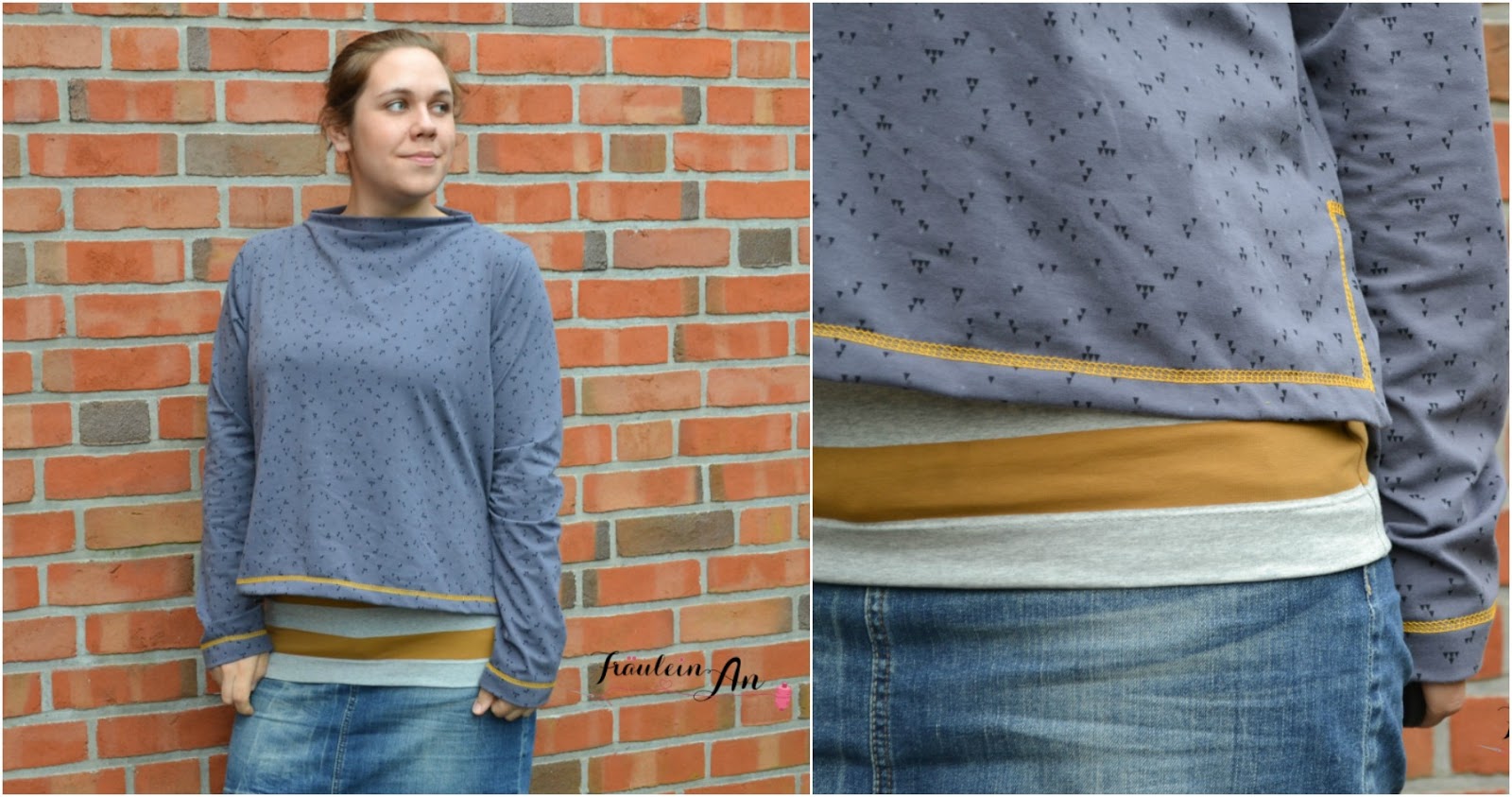 Schade, dass du dich darin nicht wohl fühlst, denn ich finde deine Version trotzdem super schön. Die Farbkombi grau/blau und senfgelb gefällt mir sehr und die perfekten Covernähte sind mir sofort ins Auge gesprungen. 😉
