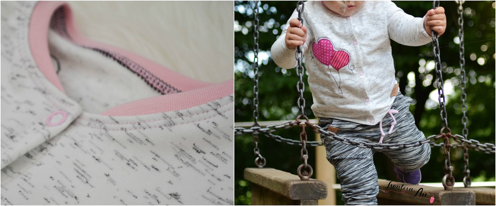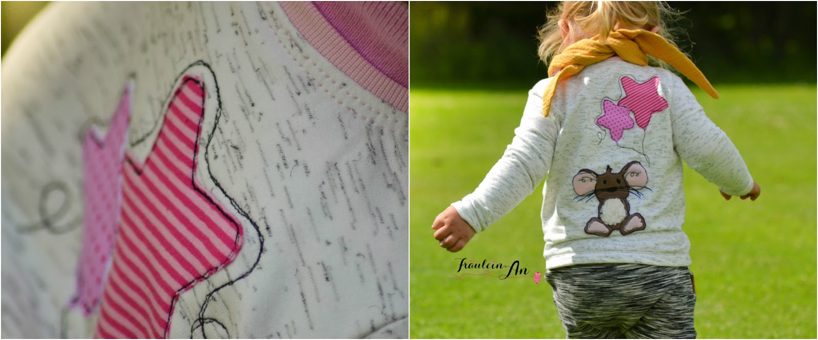Puh viel Text und ich sage nichts zur Applikation? Das hole ich nach 😉 Die Applikationsvorlage habe ich für Fred von Soho getestet. „Luftabom„* gibt es mit Hase oder Maus und mit verschiedenen Luftballonformen. Ich finde sie so zauberhaft. Die Maus ist noch vor der Änderungen entstanden und aus weichem Fleece appliziert. Da die Hummel auf Luftballons steht durften diese natürlich nicht fehlen. Vorne habe ich zwei appliziert und hinten auch – vorne auch nur, damit die Hummel auch mal etwas vom applizierten sieht 😉