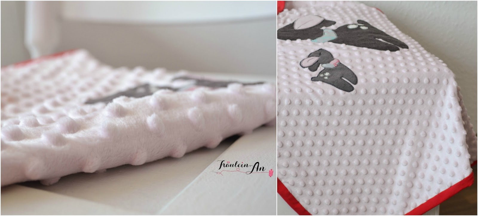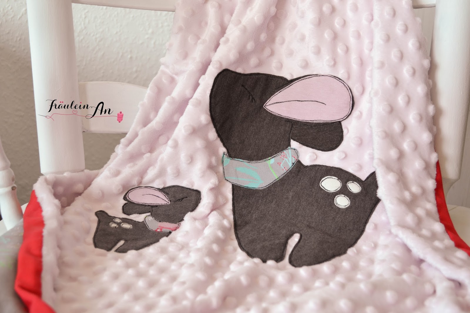 Vor 2 Jahren habe ich vom applizieren noch nicht viel hören wollen und somit blieb die Decke für die Hummel schlicht. Diese hier hat eine niedliche „Mama-Kind“ Applikation bekommen.