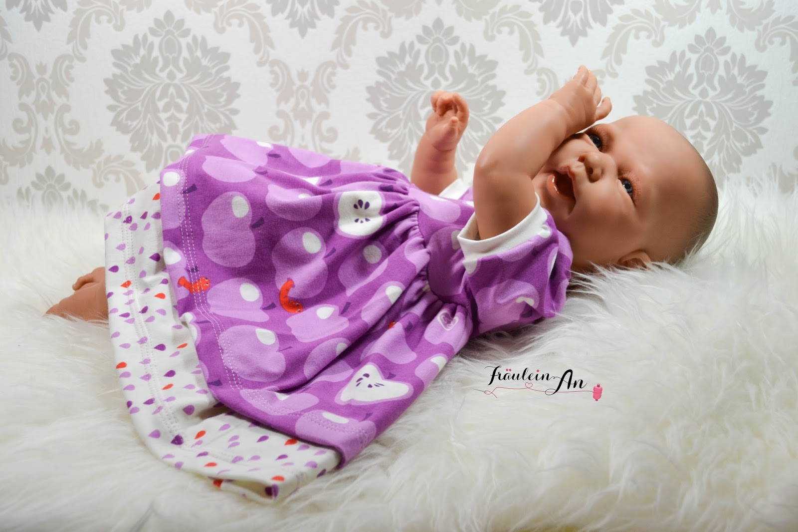 Genäht habe ich hier den Sonnentanz in Gr. 50. Es sitzt recht locker und auch das Bündchen hätte etwas enger sein können, aber es ist halt eben eine Puppe und kein Baby welches Größe 50 trägt ;-).