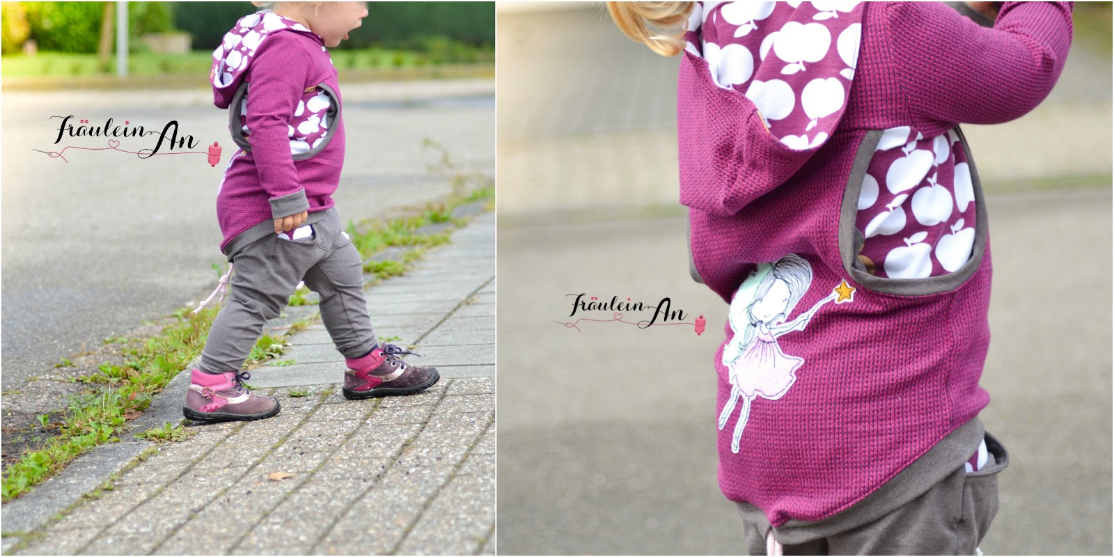 In den Taschen und in der Kapuze blitzt der wunderschöne Apfelstoff von mamasliebchen hervor. So schön. Apfelstoffe sind ja genau meins und ich gehe damit so sorgfältig um, dass ich ja nicht zuviel anschneide *g* Sie werden ja zum Glück nicht schlecht 😉