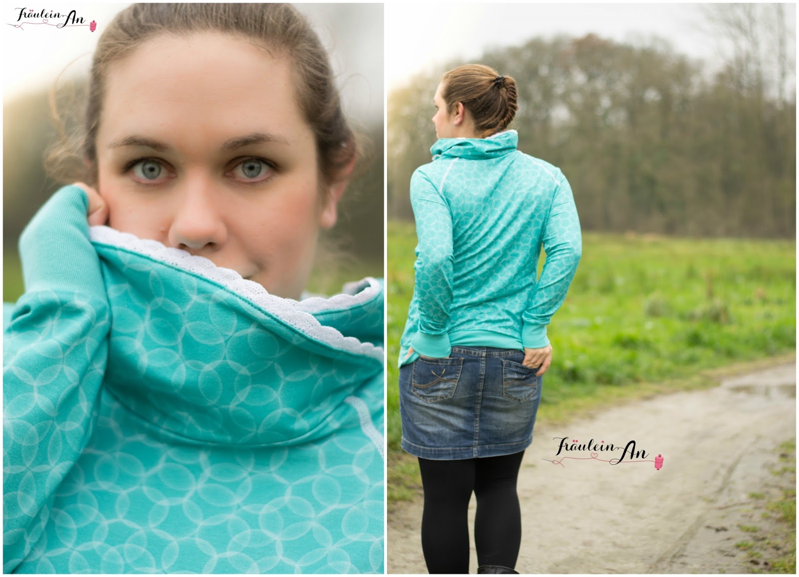 Gewählt habe ich hier einen Raglanschnitt. Es ist meine Vanja* von meine Herzenswelt geworden. Ich habe anstatt zur Kapuze zum Kragen gegriffen. Dieses Mal darf der Pulli ohne meine heißgeliebten Ösen herhalten, stattdessen habe ich ihn mit einer Vlieseinlage verstärkt – um einen besseren Stand des Kragens zu erhalten – und ein Spitzenband zwischen Innen- und Außenkragen gefasst.