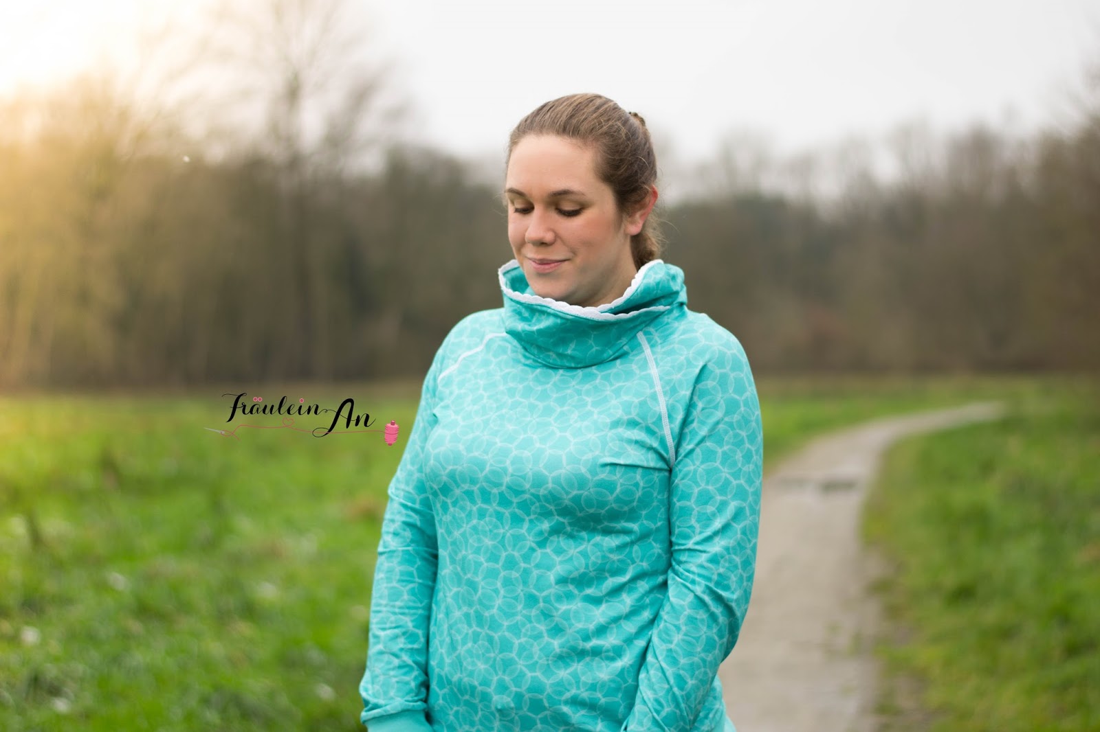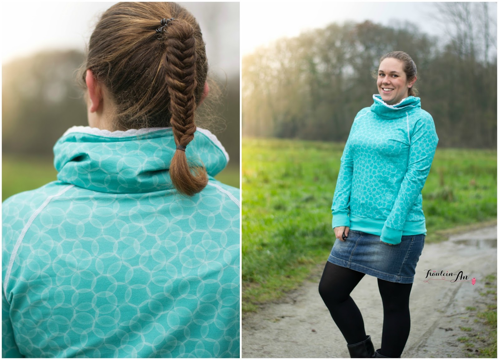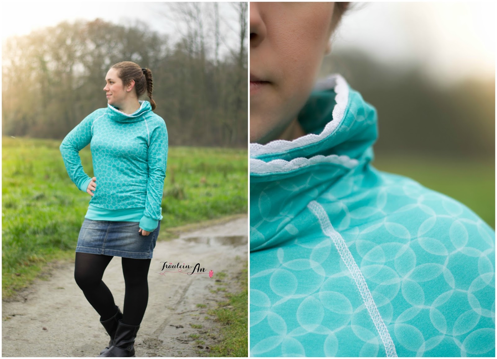 Gewählt habe ich hier einen Raglanschnitt. Es ist meine Vanja* von meine Herzenswelt geworden. Ich habe anstatt zur Kapuze zum Kragen gegriffen. Dieses Mal darf der Pulli ohne meine heißgeliebten Ösen herhalten, stattdessen habe ich ihn mit einer Vlieseinlage verstärkt – um einen besseren Stand des Kragens zu erhalten – und ein Spitzenband zwischen Innen- und Außenkragen gefasst.