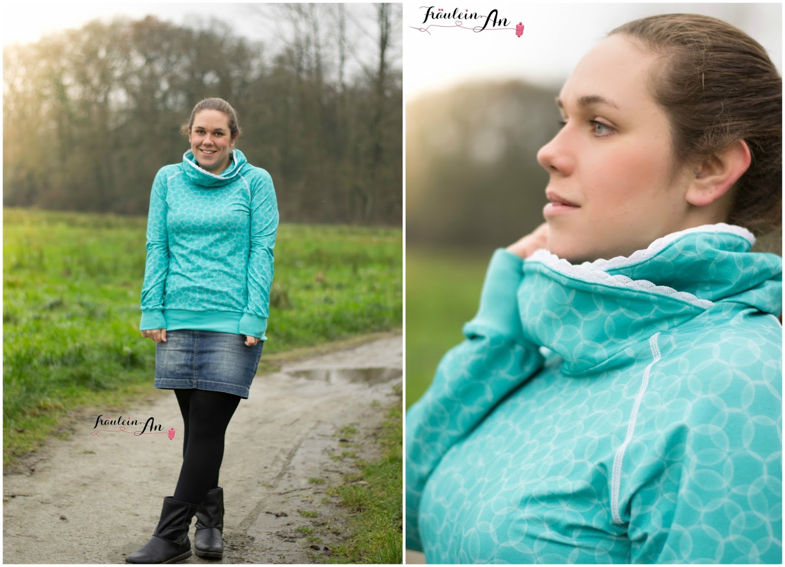 Gewählt habe ich hier einen Raglanschnitt. Es ist meine Vanja* von meine Herzenswelt geworden. Ich habe anstatt zur Kapuze zum Kragen gegriffen. Dieses Mal darf der Pulli ohne meine heißgeliebten Ösen herhalten, stattdessen habe ich ihn mit einer Vlieseinlage verstärkt – um einen besseren Stand des Kragens zu erhalten – und ein Spitzenband zwischen Innen- und Außenkragen gefasst.