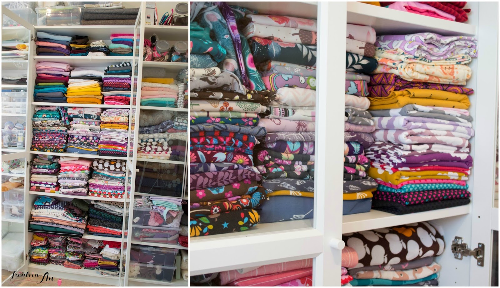 Ich muss gestehen, den Stoff habe ich erst seit kurzem hinter Glas. Vorher hatte ich alles in Boxen, einfach aus dem Grund, dass mein Nähzimmer unten in der Nähe der Küche ist und weil wir einen Kater haben. Aus Platzmangel habe ich mich dann doch für die Türen entschieden – und ich liebe es 🙂