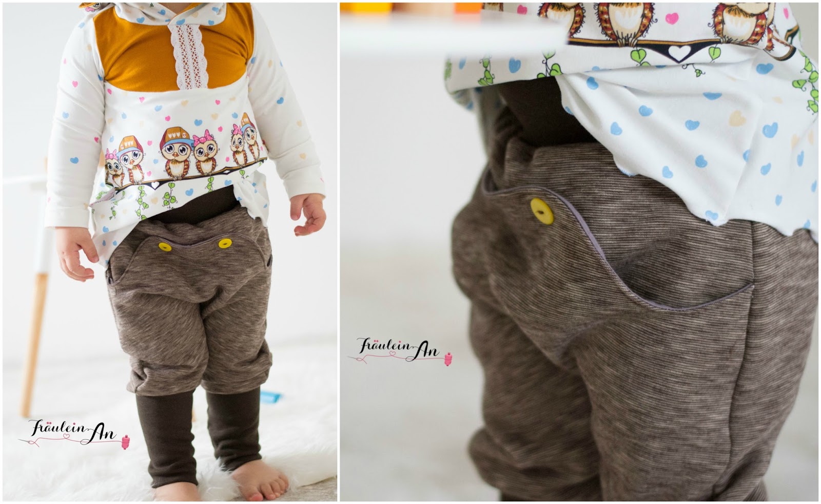 Zum Eulenshirt habe ich eine Knopfbüx genäht. Ich finde den Schnitt einfach sehr lässig und dann noch als Knickerbocker, entzückend oder? Ich habe sowieso eine Schwäche für Knickerbocker Hosen und habe damals – wie sich das anhört 😉 – als die Hummel noch kleiner war viel mehr dieser Hosen genäht. Wird Zeit es wieder öfters zu tun.
