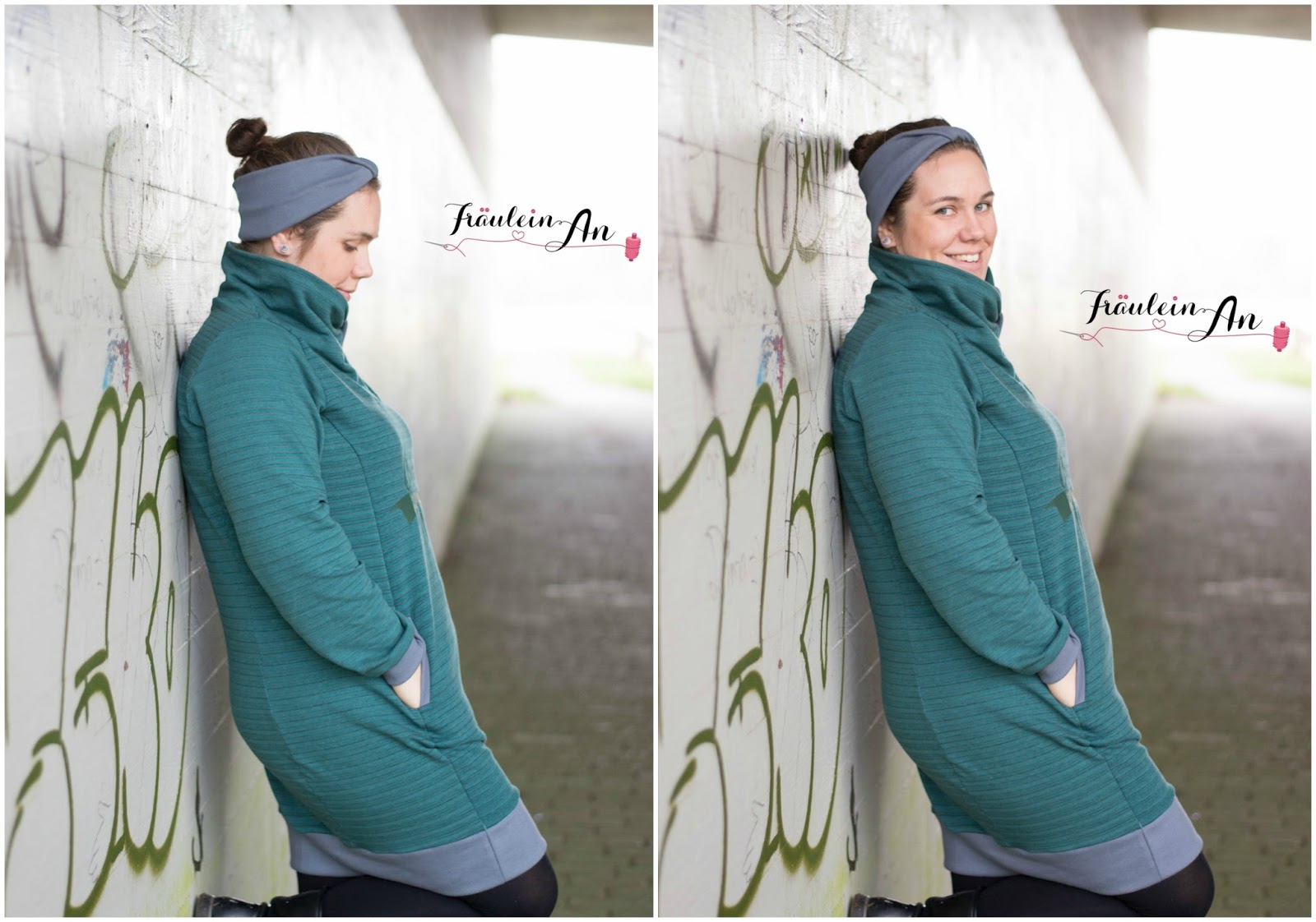 Zurück zum Thema. Zum lässigen Kleid, wollte ich gerne Fotos unter der Brücke (ich liebe es dort zu fotografieren, es ist immer so schön ruhig*g*) vor den nicht ganz so schönen Graffitis zu machen. Und dann kam mir das Freebook von Fritzi Schnittreif sehr gelegen. Kurzerhand habe ich mir also noch ein Twiststirnband aus Bündchen genäht. So schön warm und ich liebe es.