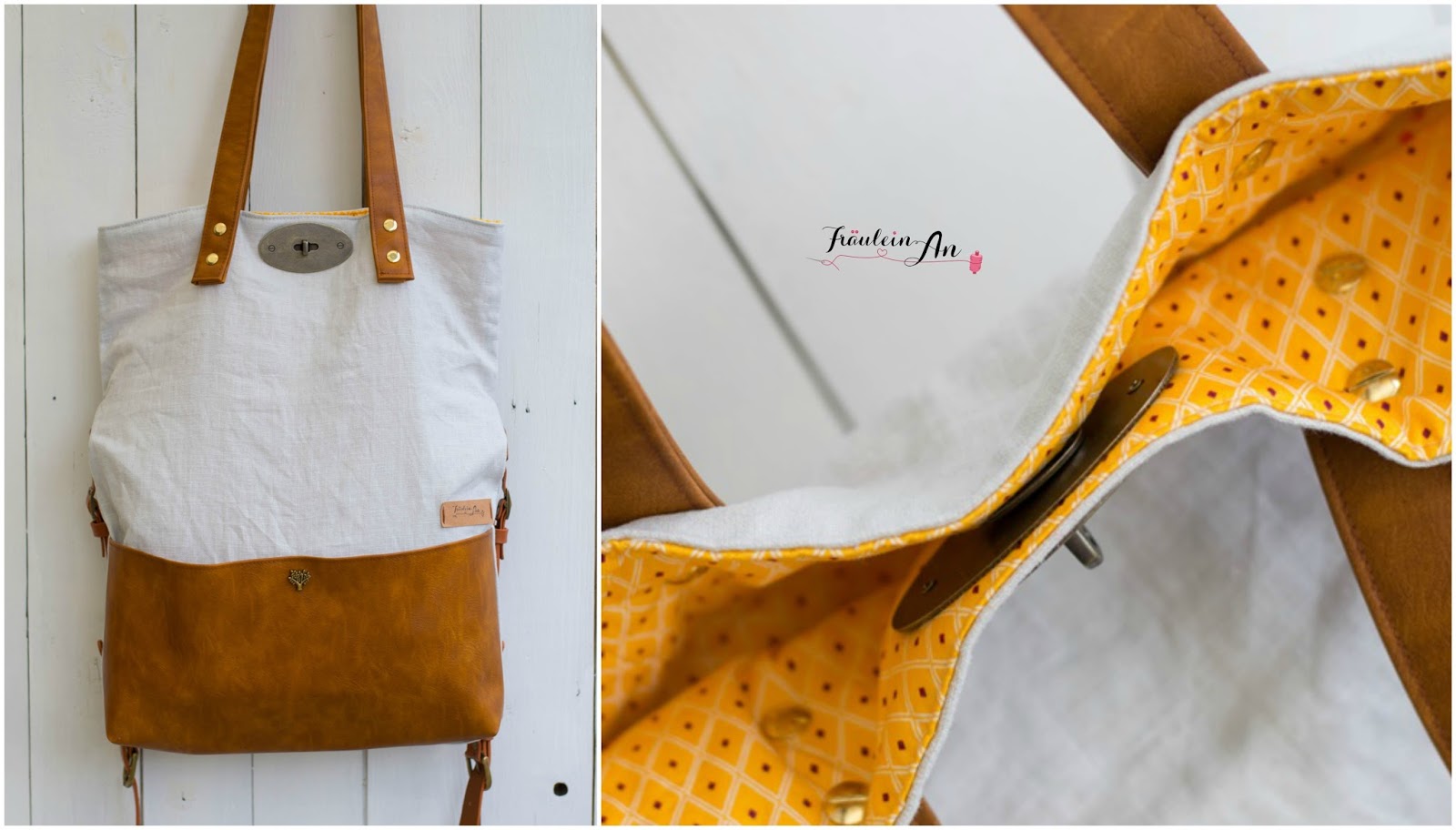 Meine Anni hier ist mit Tragegriffen aus Kunstleder ausgestattet. Anstatt sie zwischen dem Außen und Innenstoff zu nähen, habe ich sie mit Buchschrauben angebracht. Sieht schon ganz geil aus oder?