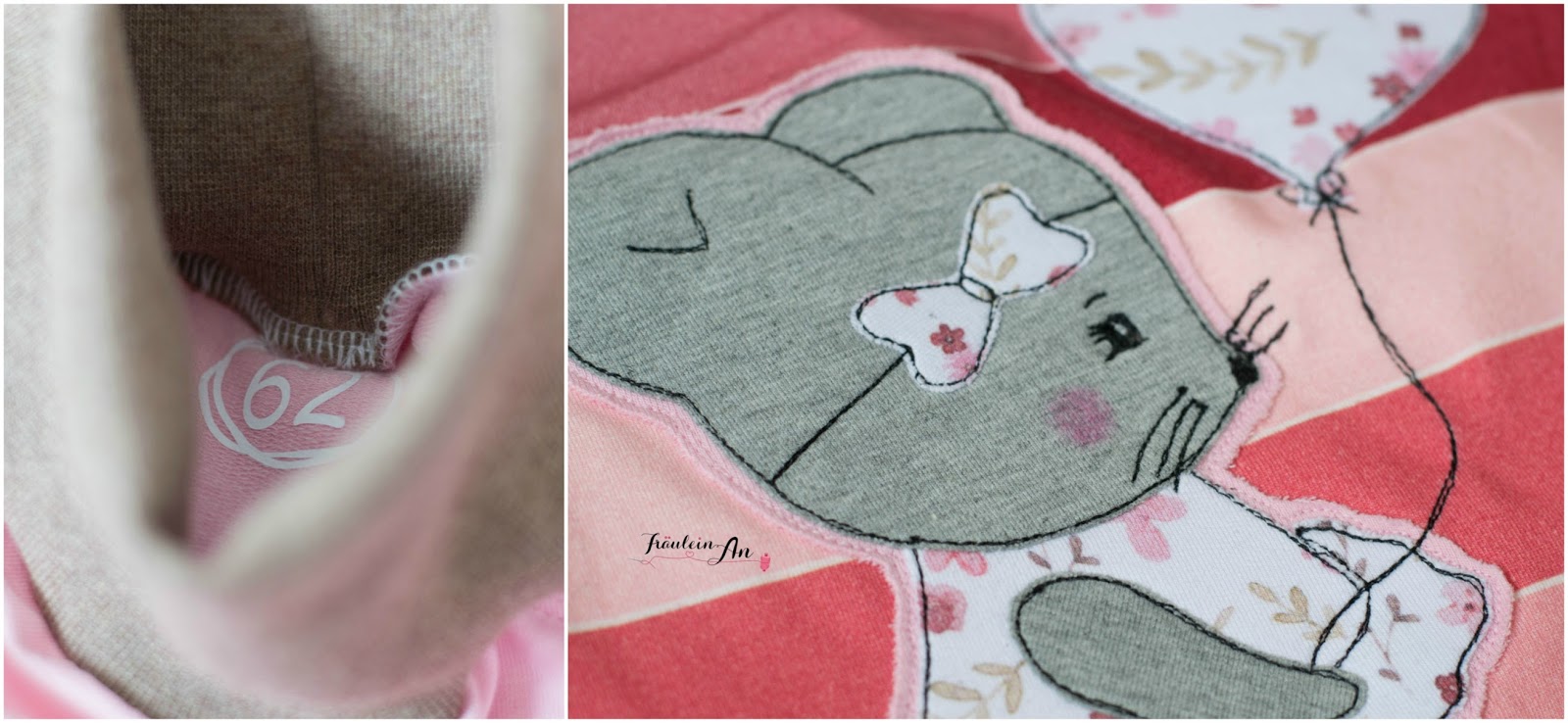 Für diese niedliche Maus habe ich ein Babyset für ein Mädchen in Größe 62 genäht. Dieses komplette Set ist auch mein erstes Produkt – ja so kann man es sagen – welches ich zum Sofortkauf anbiete.