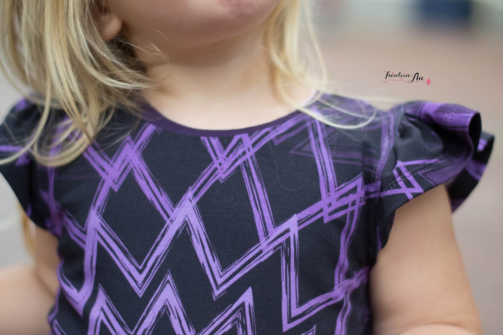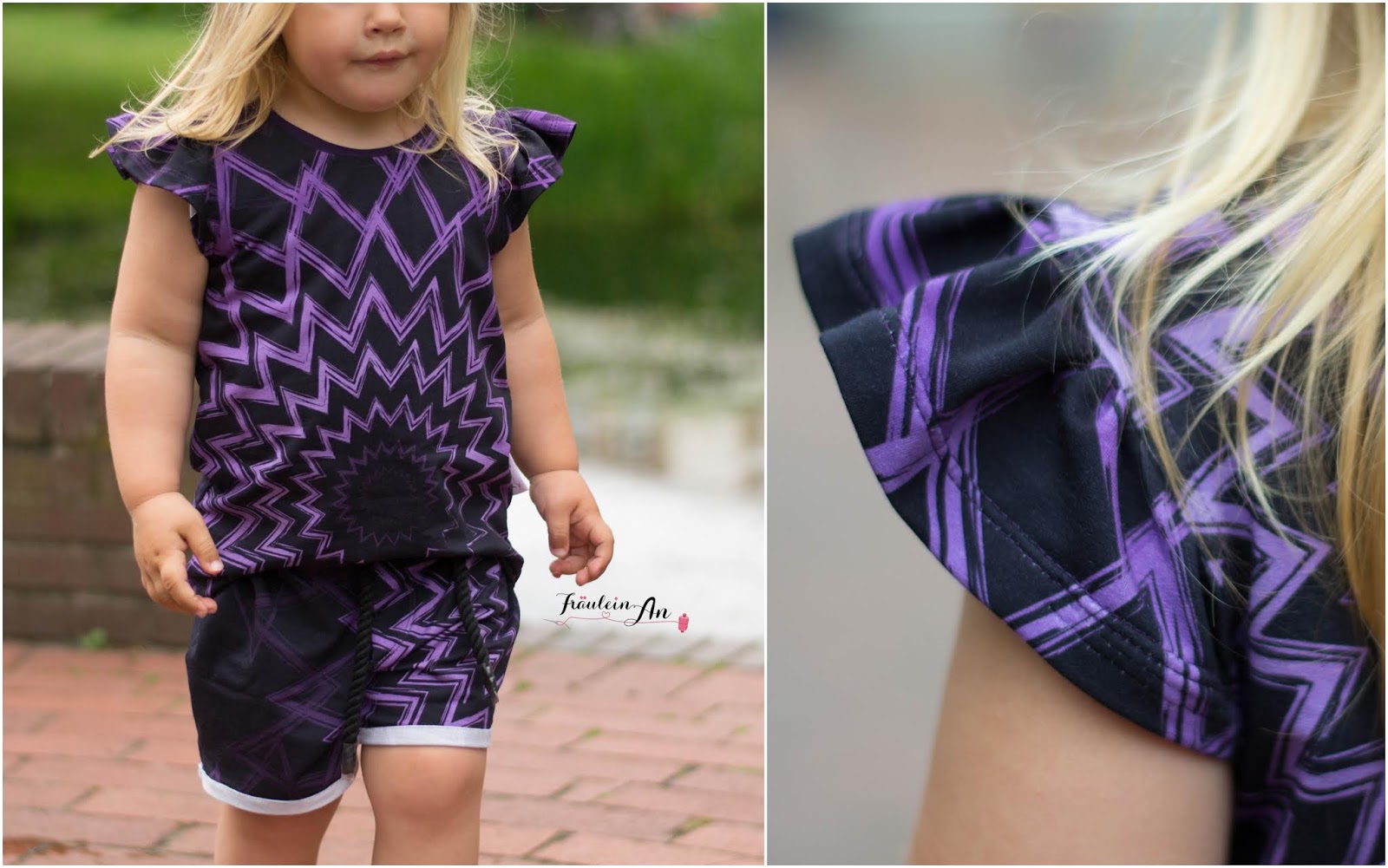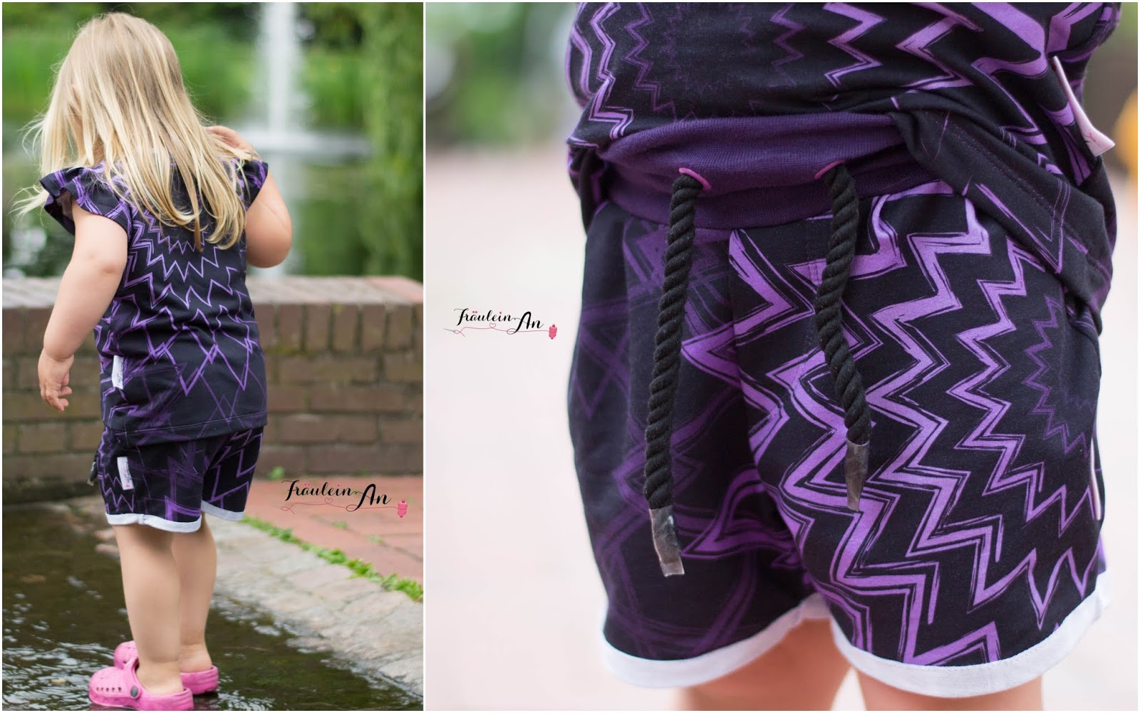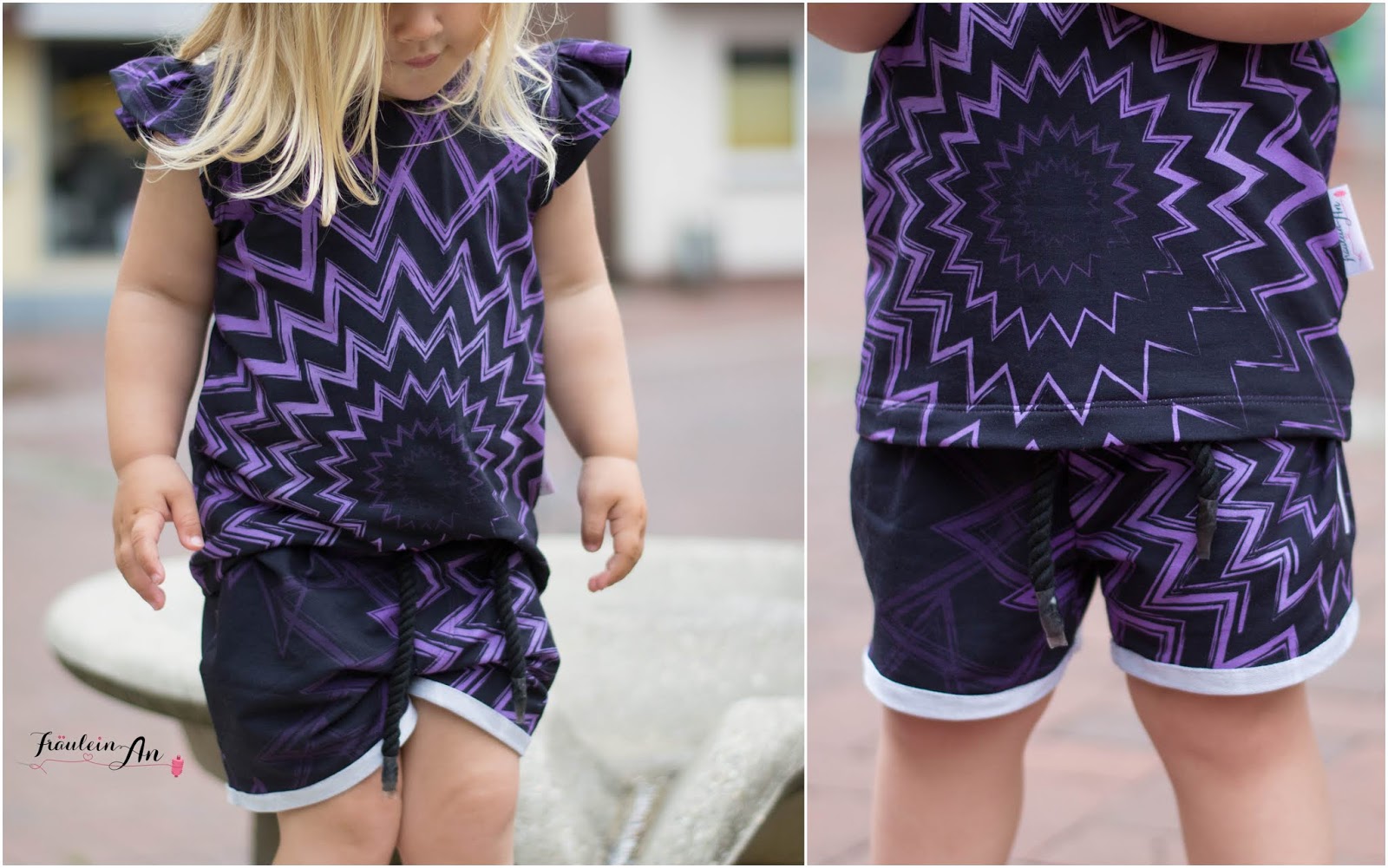 „Energy Blossom“ kommt in mehreren Farben daher. Ich habe hier „ultra violett„* vernäht. Das Muster ist für groß und klein mega und wie ihr seht, auch fast 3 Jährige können das große ZickZack Design von ca. 75cm gut tragen 🙂