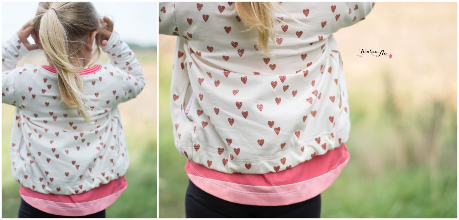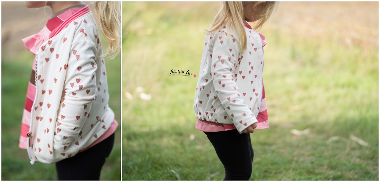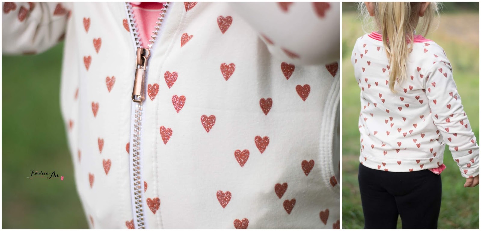 Der Kupferreißverschluss passt hier auch einfach perfekt und meine Tochter liebt die Jacke. Ja sie liebt sie 😉 Zur Zeit verteilt sie nämlich reichlich Liebesbotschaften. Sie liebt quasi alles 😉 Glück für mich, so liebt sie nämlich alles was ich nähe ;-).